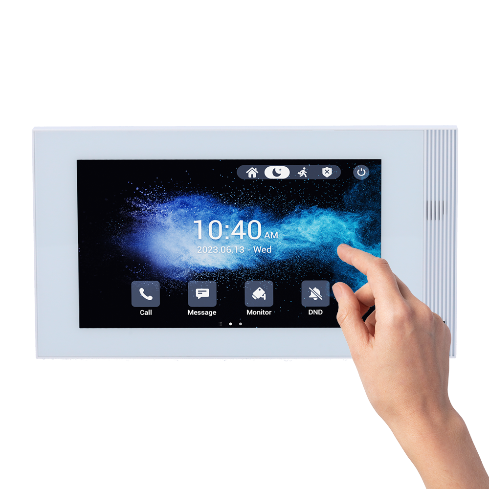 Concebido para apartamentos e moradias. Permite atender chamadas do painel exterior, abrir portas ou portões e visualizar câmaras compatíveis numa interface intuitiva. Integração IP para gestão centralizada.