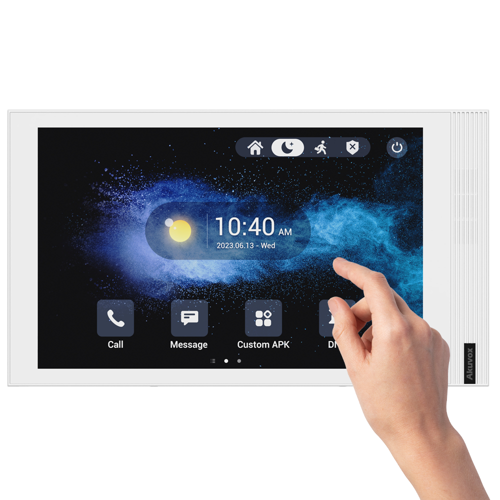 Ideal para apartamentos, moradias e pequenos negócios. Permite atender chamadas do painel exterior, abrir portas/portões e visualizar câmaras compatíveis numa interface simples. Integração IP para ligação em rede e gestão centralizada.