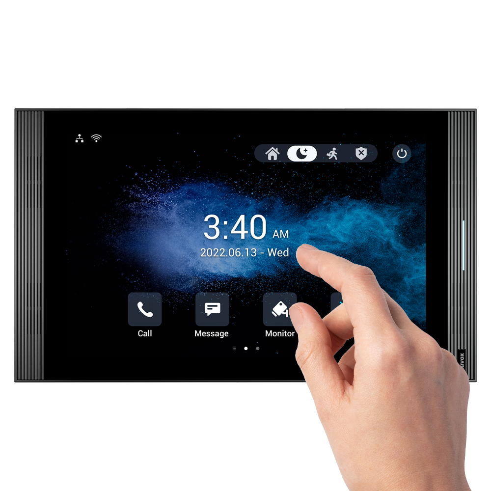 Ideal para apartamentos, moradias e pequenos negócios. Permite atender chamadas do painel exterior, abrir portas/portões e visualizar câmaras compatíveis numa interface simples. Integração IP para ligação em rede e gestão centralizada.
