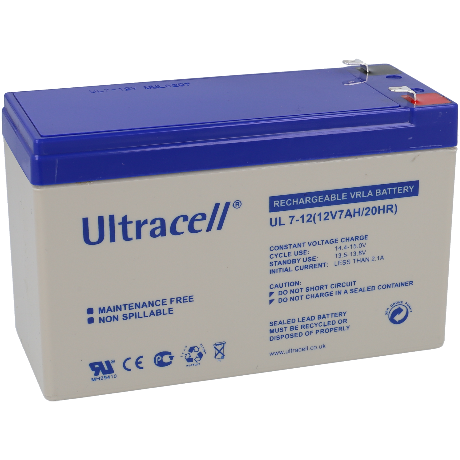 Home 12V bateria 12v 7ah-Ultracell UL7-12-Ultracell UL7-12 bateria 12v 7ah-Ultracell UL7-12-Ultracell UL7-12 SKU: UL7-12 17,77 € 18,71 € Desconto de %. IVA incluído. Comprar Contactar Adicionar à wishlist Especificações Capacidade nominal: 7.0 / 6.51 / 6.0 / 5.37 / 4.55Ah (20 / 10 / 5 / 3 / 1 hr a 25º) Capacidade: 7Ah Dimensões: 151 x 65 x 99 mm Intensidade de descarga: 105 A max. (5 s) Intensidade inicial: Menor que 2.1 A Material: Acidoplomo (VRLA) Modo standby: 13.5V ~ 13.8V Peso líquido: 2000 g Resistência interna: 23m? Tipo de conexão: F1 , F2 opcional Uso cíclico: 14.4V ~ 15V Vida operacional a 20ºC: 5 anos Voltagem nominal: 12V Marca ULTRACELL Partilhar