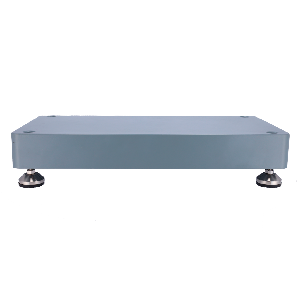 Base retangular cinza com apoios metálicos circulares