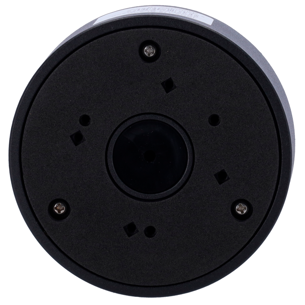 Adeus às caixas de eletricista inestéticas. Esta base fica posicionada diretamente atrás da câmara, servindo para guardar e proteger os conectores (RJ45/Alimentação) contra a água e poeiras, mantendo a fachada do edifício limpa visualmente.