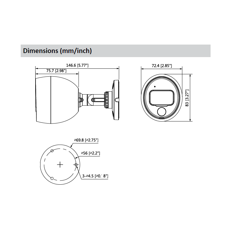 Sensor: CMOS ® Resolução sensor: 3840 x 2160 Tamanho Sensor: 1/2" Velocidade electrónica obturador: 1/4s ~ 1/100,000s Iluminação mínima: 0.005Lux Ratio S/N: Mais de 65dB Distância visão noturna: 20 m Número de LEDS: 1 IR ON/Off: Sim Smart IR: Sim Tipo lente: Fixa Distância focal: 2.8 mm Máxima abertura diafragma: F/1.6 Ângulo de visão: 110.8° Distância mínima abordagem: 1800mm Detectar: 84 m Observar: 34 m Reconhecer: 17 m Identificar: 8 m Movimento: 3-Axis Resolução vídeo: 8 Megapixels Imagens por segundo: 15fps@4K , 20fps@6MP , 25 / 30fps@4MP Saída de vídeo: 1 x BNC HDCVI alta definição Modo dia / noite: Automático / Manual Menu OSD: Sim BLC: Sim HLC: Sim 2D-NR: Sim 3D-NR: Sim AGC: Sim AWB: Sim WDR: WDR (120 dB) Modo detecção PIR: Infravermelho Tipo aviso PIR: Led Vermelho Altura de montagem PIR: 2.2m ~ 2.5 m Modo alimentação: DC Tensão: 12V Consumo (w): 5.3W Amperagem: 450mA Temperatura de operação: -10°C ~ +50°C Grau de protecção: IP67 Uso: Interior / Exterior Humidade máxima: 95% Material: Alumínio e plástico Dimensões: 146.6 x 72.4 x 83 mm Peso líquido: 250 g Peso com embalagem: 330 g Tecnologia: HD-CVI Tipo de câmara: Bullet Serie: IoT Distância detecção PIR: 10 m ; 110°
