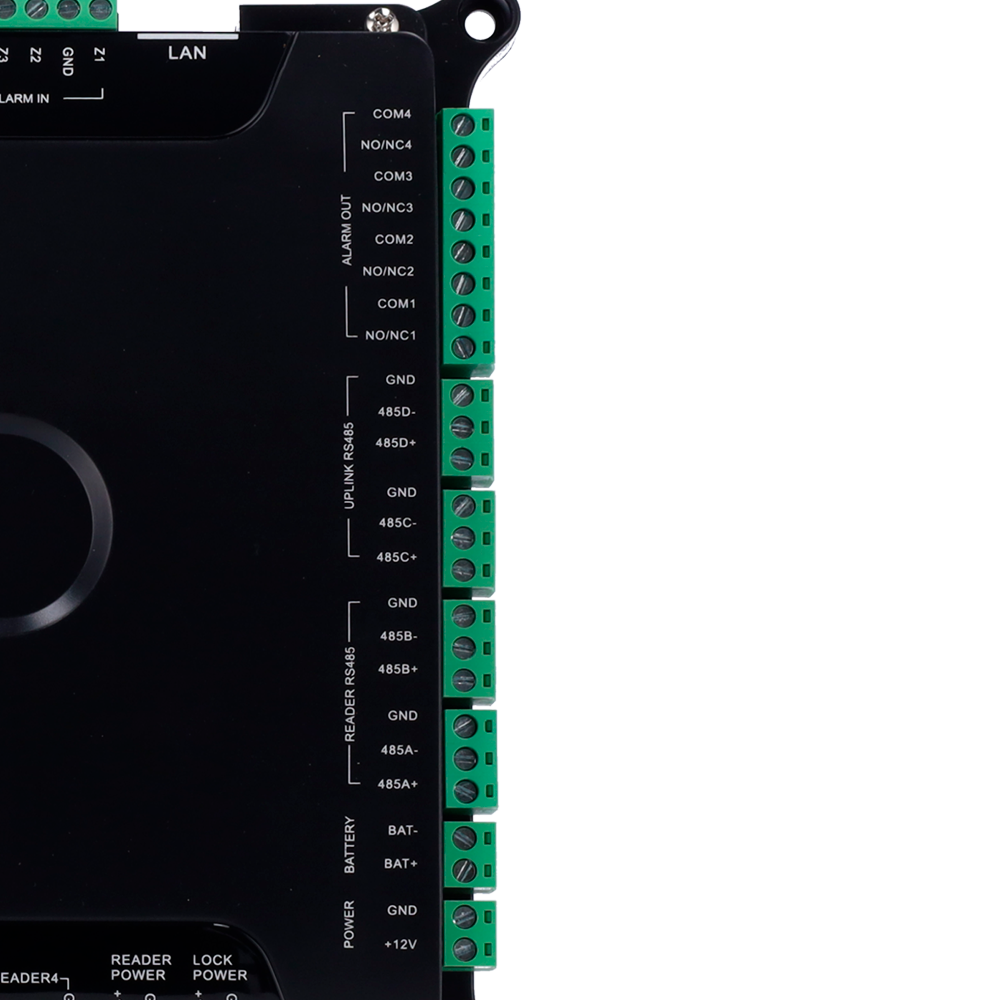 | Entradas | 4 x Wiegand 26/34, 2 x RS485/OSDP, 2 x sensor de porta, 4 x botão de abertura, 4 x auxiliar, 1 x entrada de alarme |