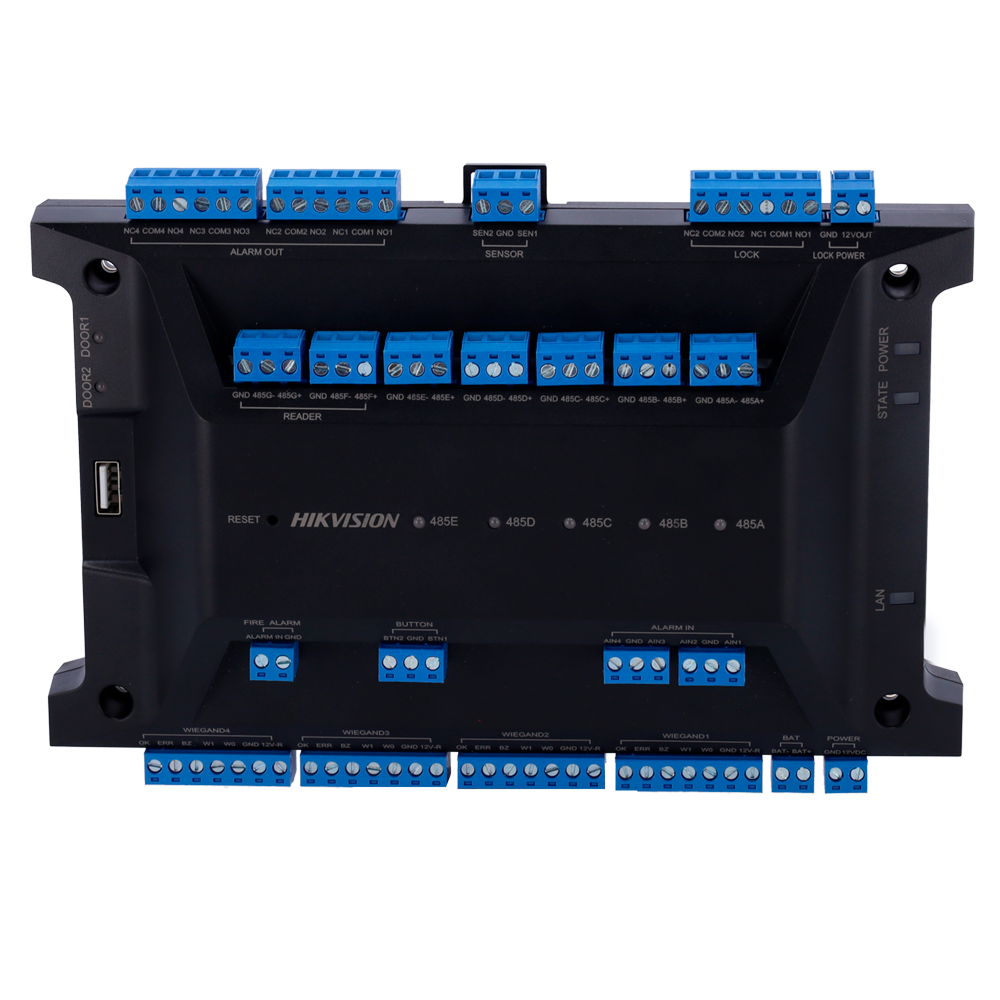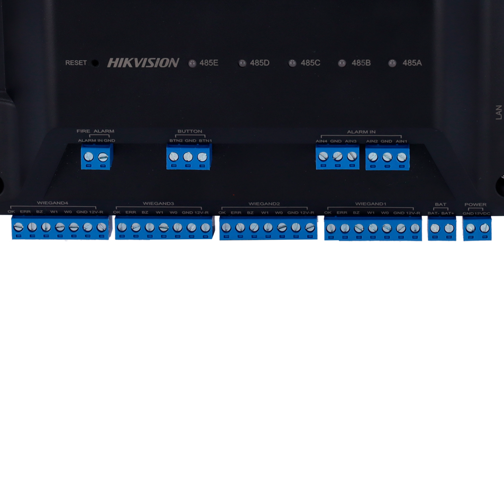 | Entradas | 4 x Wiegand 26/34, 7 RS485 x (5 2 x comunicação / RS485/OSDP), x leitor 2 2 4 x sensor de porta, 1 x botão de abertura, 1 x entrada de alarme, [%VAR%] x incêndio, [%VAR%] x tamper |