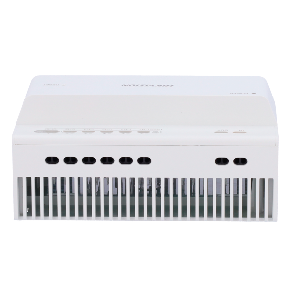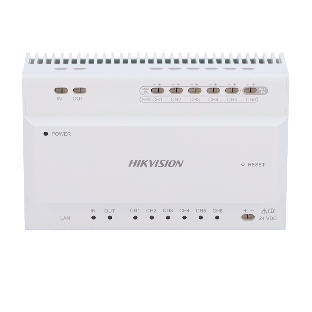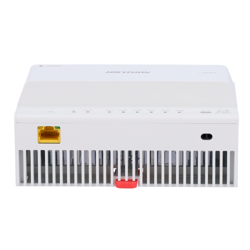 Acessorio para videoporteiro Hikvision conversor de 2 fios para IP com 6 canais, incluindo 1 canal de 16 W, interface Ethernet RJ45 e montagem em superficie ou carril.