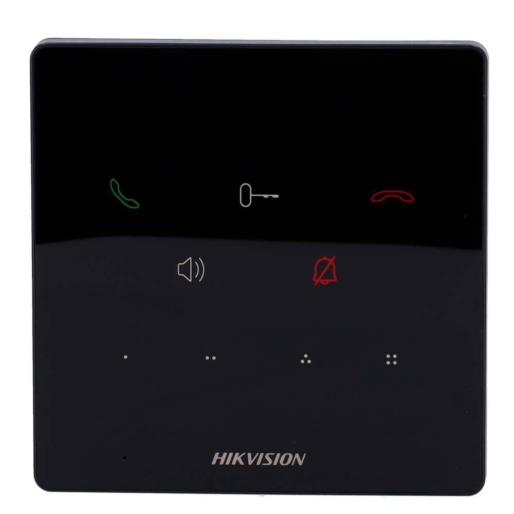 Monitor de videoporteiro Hikvision IP sem ecra com 9 botoes tacteis para chamada e abertura de portas; integracao via SIP.