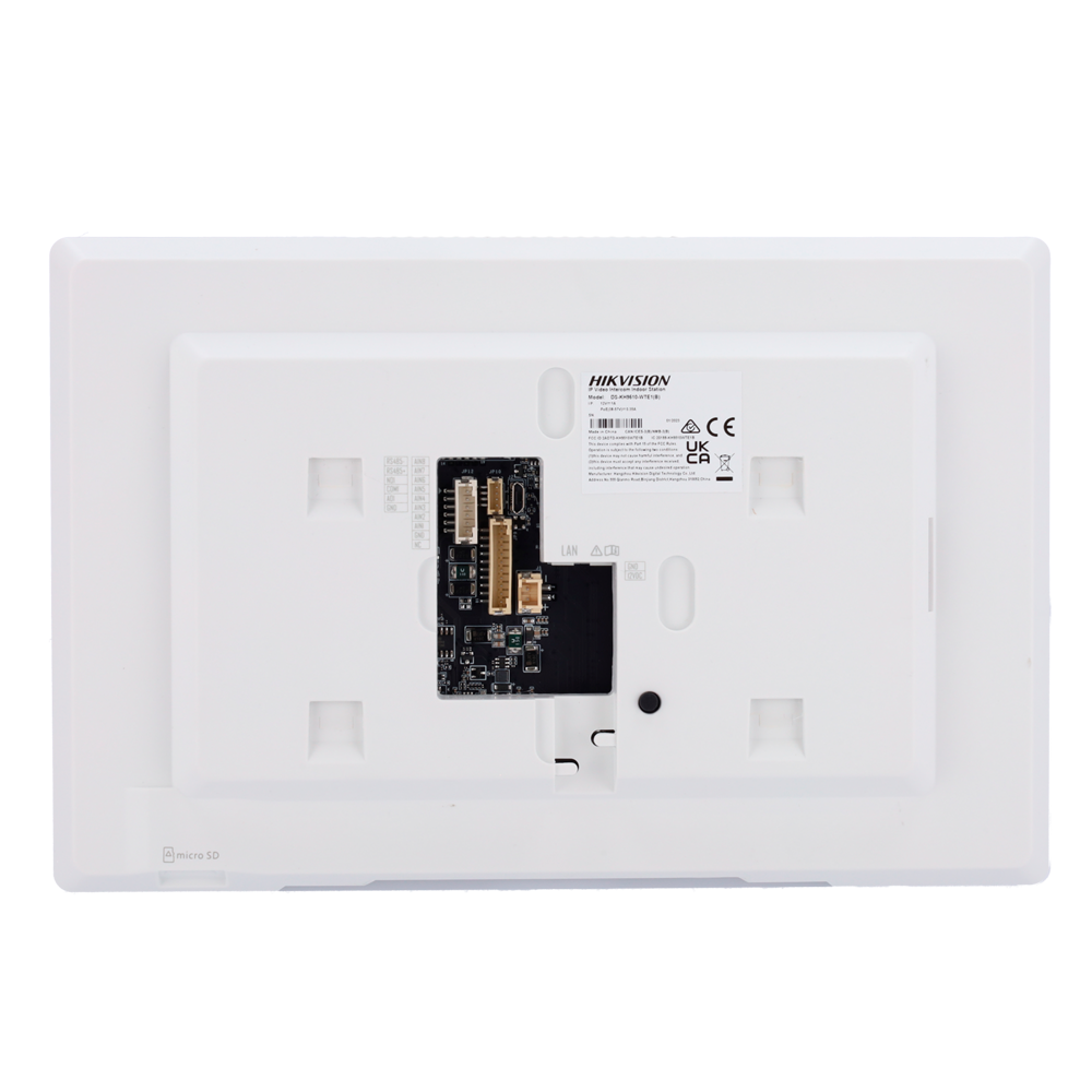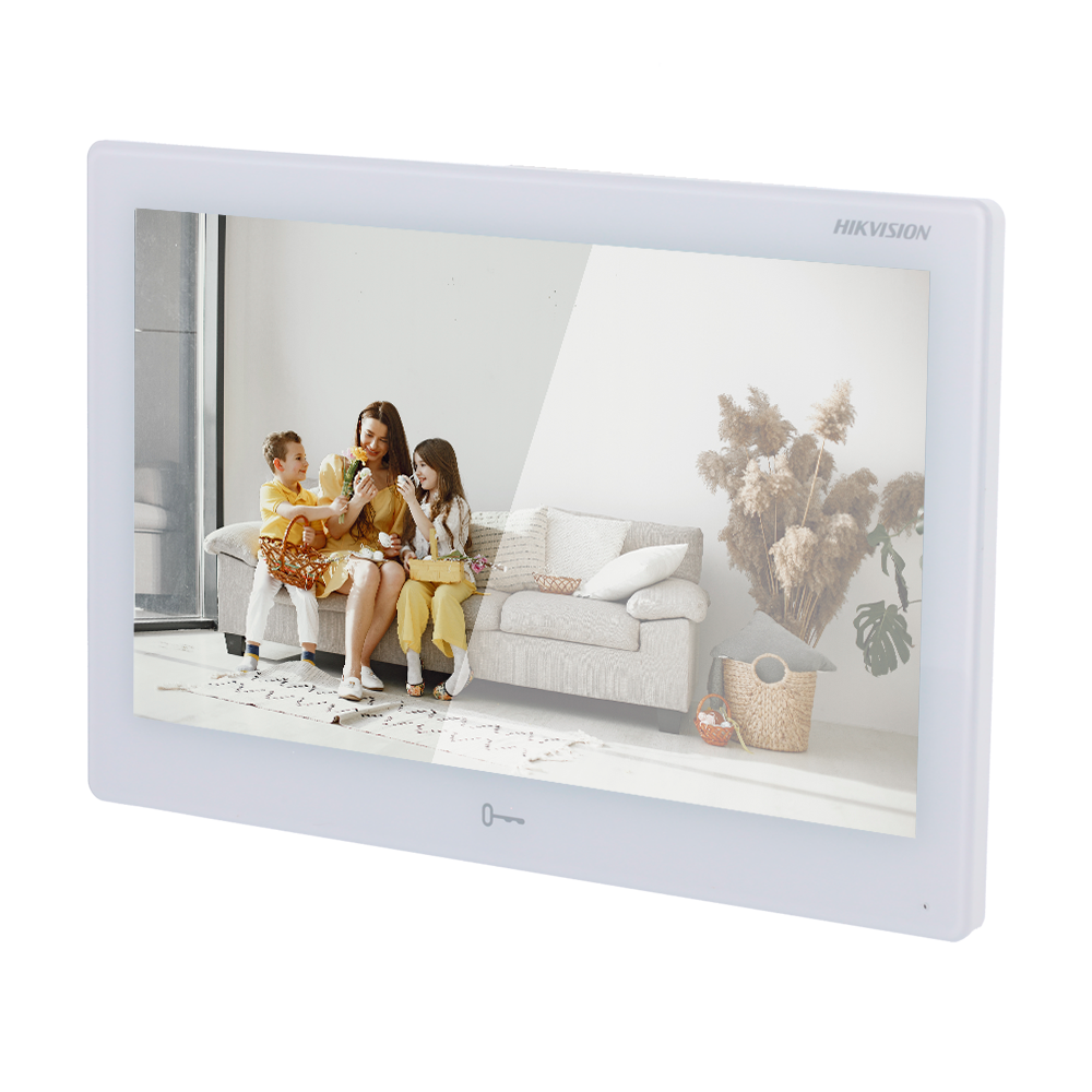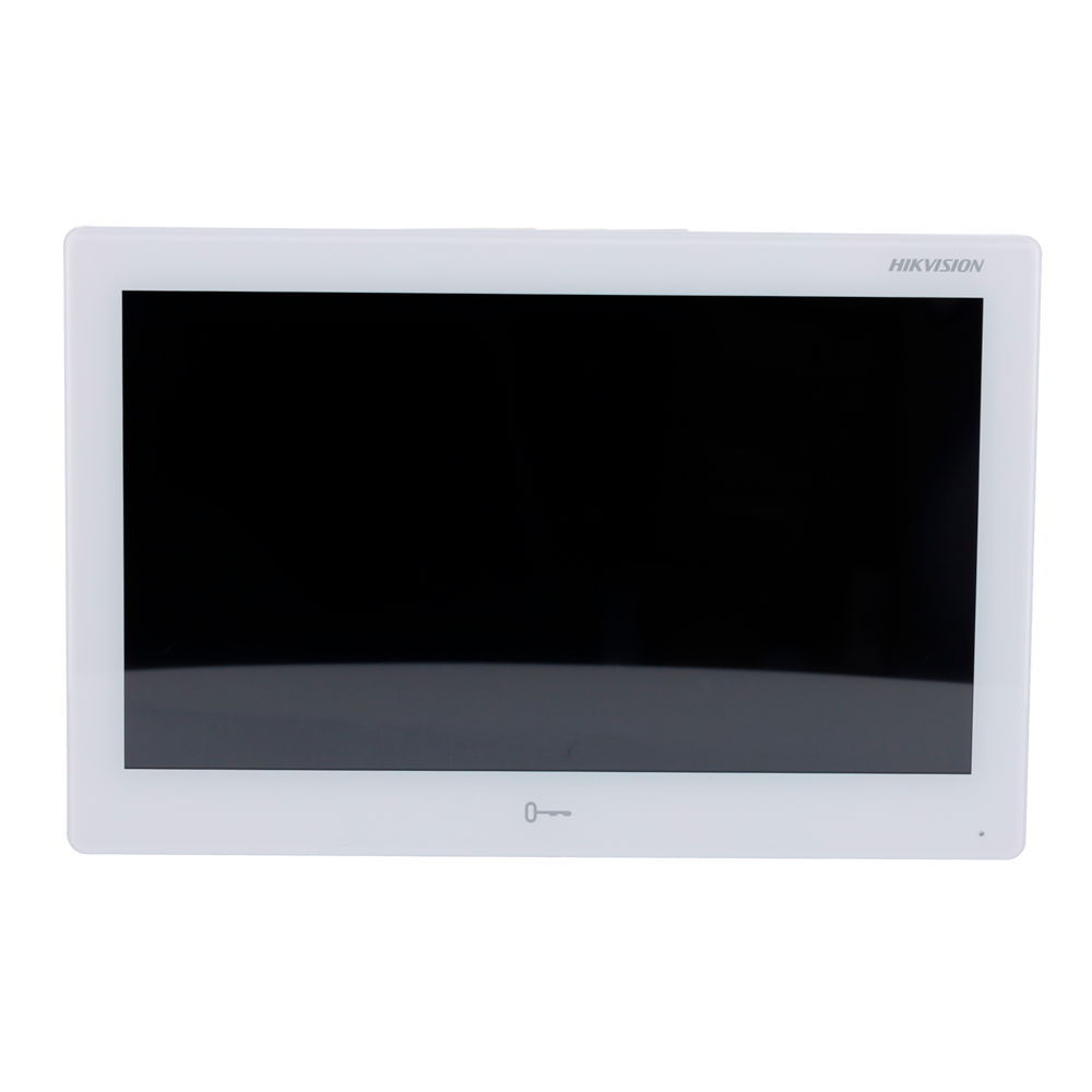 Monitor de videoporteiro Hikvision com ecra TFT tactil de 10 polegadas, sistema Android, audio bidirecional, ligacao TCP/IP e Wi-Fi.
