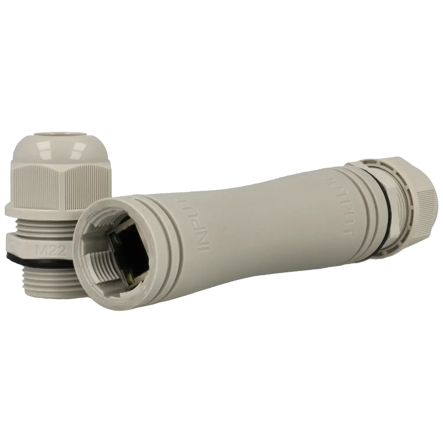 Extensor PoE cinza claro cilíndrico com conectores nas extremidades