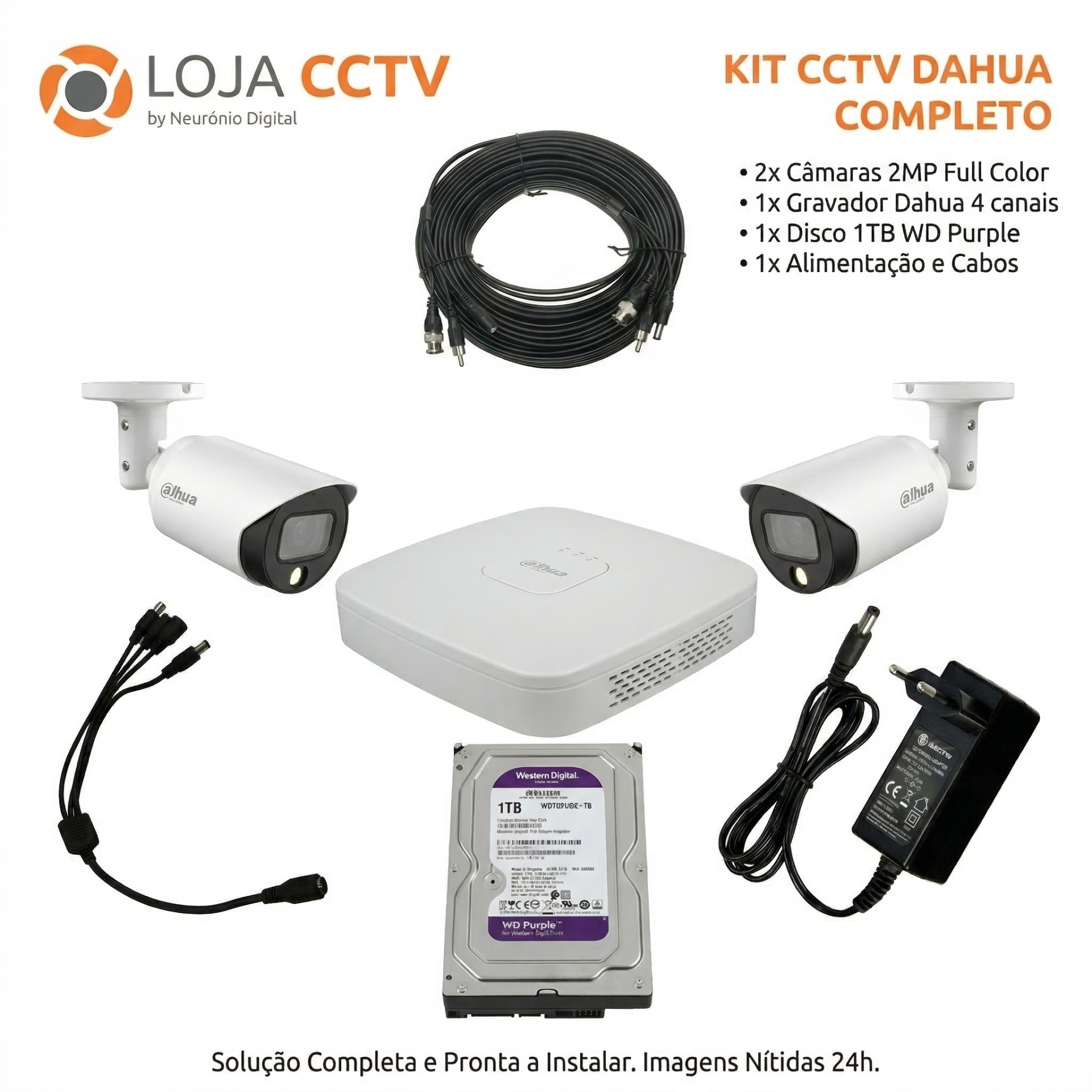 Kit CCTV Dahua 2 Câmaras 2MP Full Color, Gravação 1TB