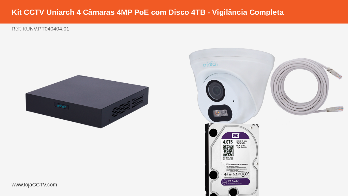 Proteja o seu espaço com o Kit CCTV Uniarch, uma solução completa e pronta a instalar. Este kit combina tecnologia Uniarch com a fiabilidade Western Digital para uma videovigilância de alta qualidade.