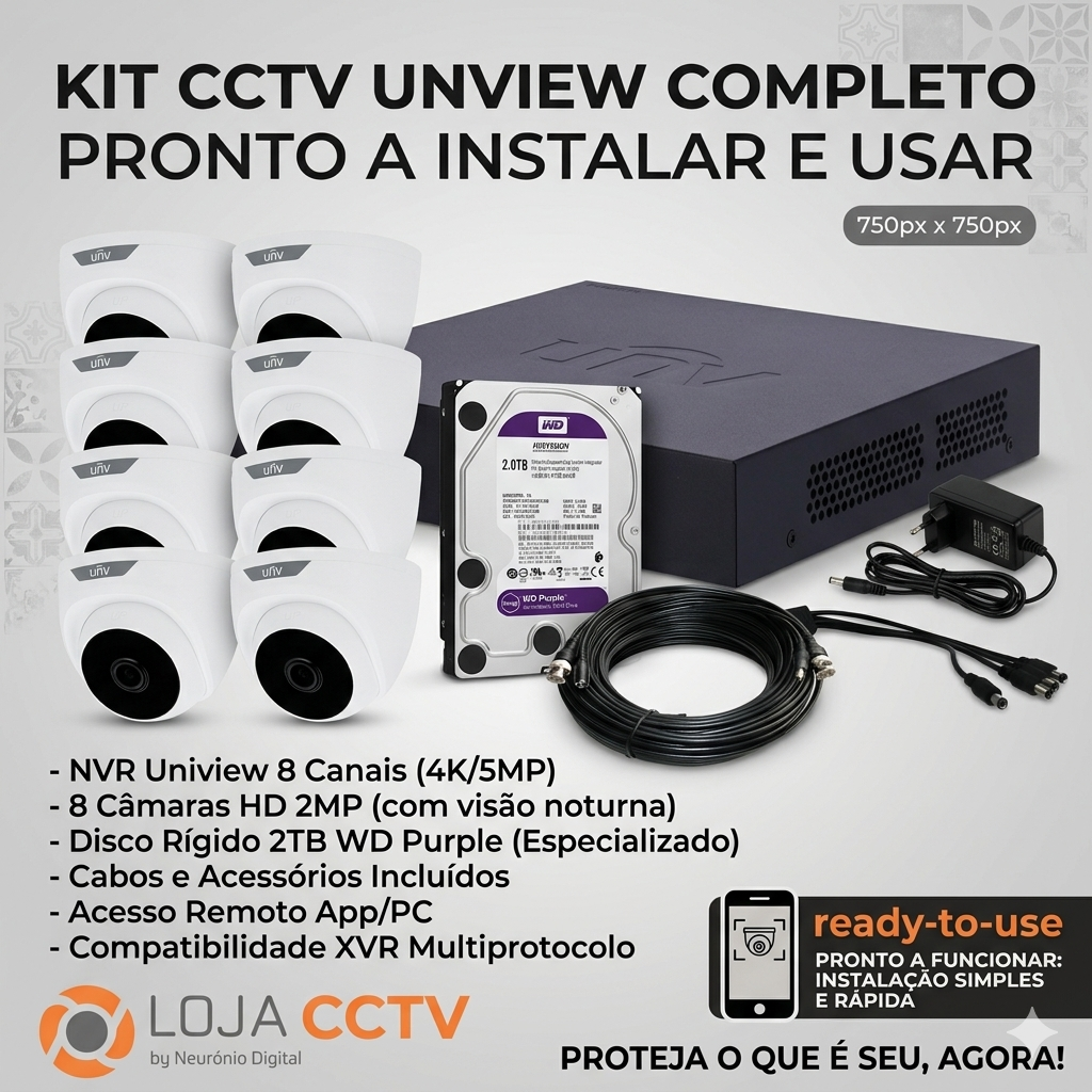 Este kit CCTV Uniview oferece uma solução de segurança completa e pronta a instalar. Inclui um gravador XVR de 8 canais, 8 câmaras de alta definição de 2MP e um disco rígido de 2TB para armazenamento de vídeo contínuo. Ideal para proteger a sua casa ou empresa.