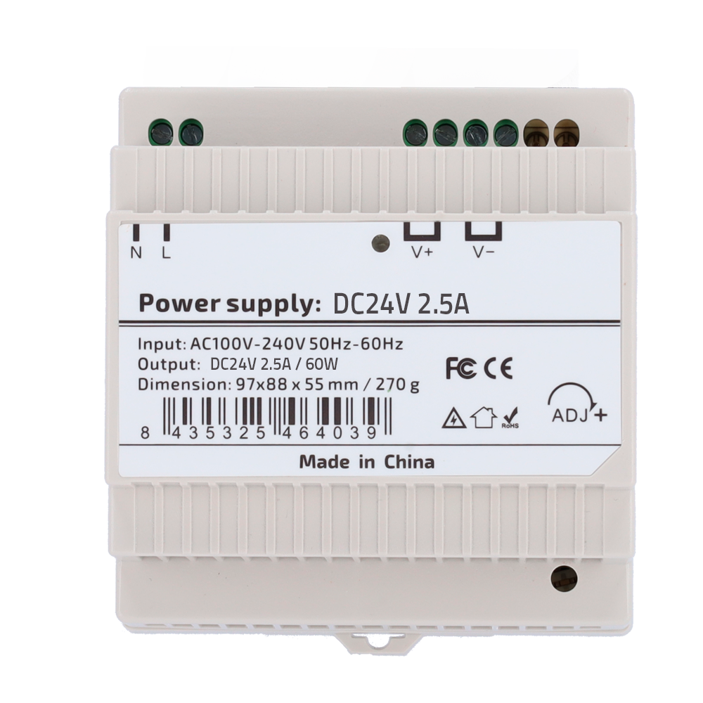 Fonte DC 24V 2.5A (60W) com montagem em carril DIN, robusta e fiável para aplicações de automação e segurança.