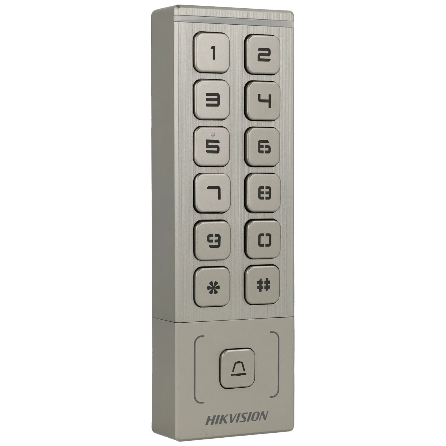 O Hikvision DS-K1T809MX é um leitor de controlo de acessos autónomo, ideal para gerir o acesso a edifícios e instalações de forma segura e eficiente. Este dispositivo combina um leitor de cartões MF (13.56 MHz) e um teclado PIN, oferecendo versatilidade na identificação de utilizadores. Com a sua classificação IP65, é adequado para instalação tanto em ambientes internos como externos.