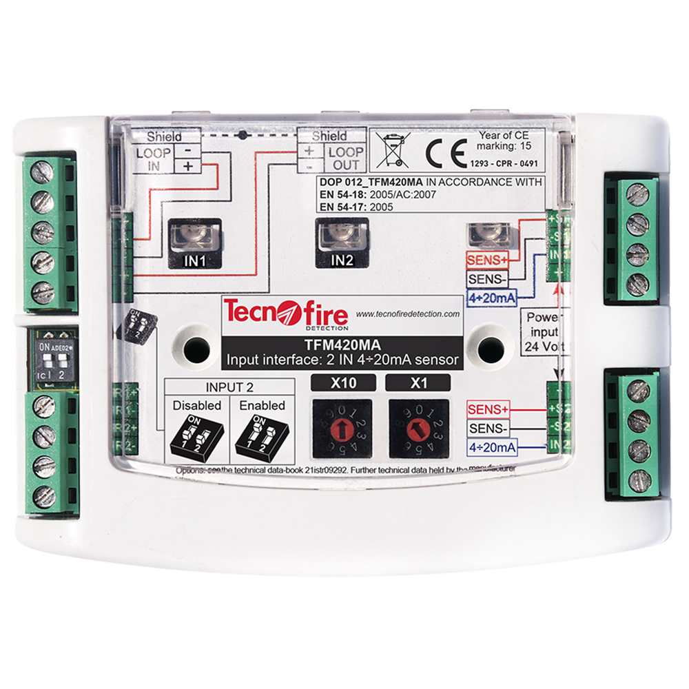 O módulo endereçável TF-TFM420MA da TECNOFIRE permite a ligação de dois dispositivos com saída 4-20mA, supervisionados individualmente pelo sistema de deteção de incêndio. Cada entrada ocupa um máximo de duas direções e oferece funções programáveis, como pré-alarme com umbrais ajustáveis de forma independente. Com 4 critérios de funcionamento (alarme, silêncio, restabelecimento e nenhum) e 2 saídas repetidoras de estado, este módulo assegura uma gestão completa através do protocolo RSC®, incluindo programação, gestão remota e controlo de todos os parâmetros de funcionamento.