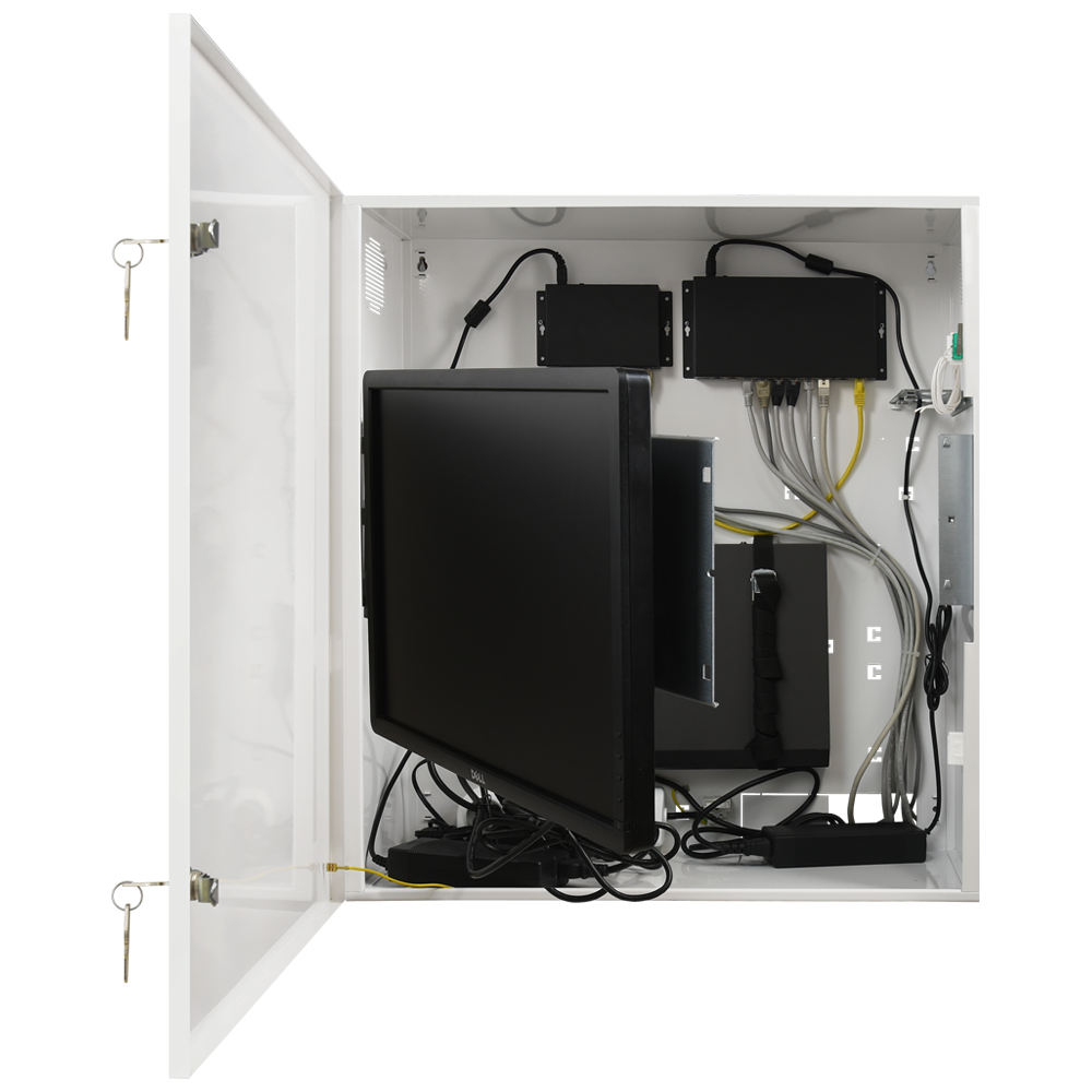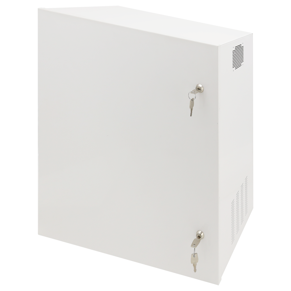 O RACK-WALL-PRO é um armário de parede profissional 19'4U, com grelha de ventilação e espaço dedicado para 4x7Ah (UPS/DC). Integra gravador, monitor até 22' e switches PoE.