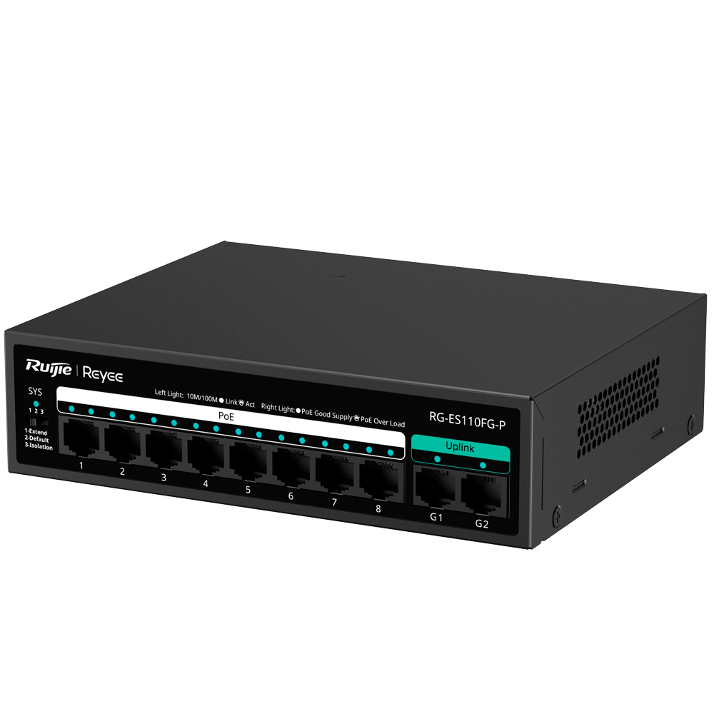 Home Switch PoE RG-ES110FG-P RG-ES110FG-P SKU: RG-ES110FG-P 113,30 € 119,26 € Desconto de %. IVA incluído. Comprar Contactar Adicionar à wishlist Reyee PoE Desktop SwitchCaixa metálica8 puertos RJ45 10/100 Mbps8 Portas PoE+ 802.3af/at + 2 Portas UplinkPlug and PlayTecnologia de poupança de energiaEspecificaçõesMarca:ReyeeInterface:8 puertos RJ45 (2 Uplink + 8 Downlink)Velocidad puertos:10/100Mbps + 2 Uplink 10/100/1000MbpsCaracterísticas del PoE:Potencia PoE total de 110WFunciones:Aislado de Puertos, Poe Watchdog, Poe ExtendidoGestión:No gestionable, pero visible desde Ruijie cloud si al menos hay un sw gestionable en la instalaciónAncho de Banda:5,6GbpsTasa de Reenvío de Paquetes:4,17MbpsTabla MAC:8KTecnologías Soportadas:Modo Auto-Negociación / Auto MDI/MDIXProtección de sobretensiones:4 kVAlimentación:100~240vAC 3.0AConsumo Máximo:< 110WTemperatura de funcionamiento:0º C ~ 45º CDimensiones:166 x 132,6 x 43 mmPeso:1,22Kg Partilhar