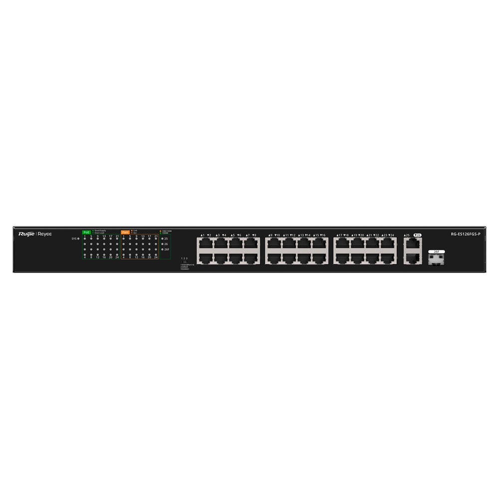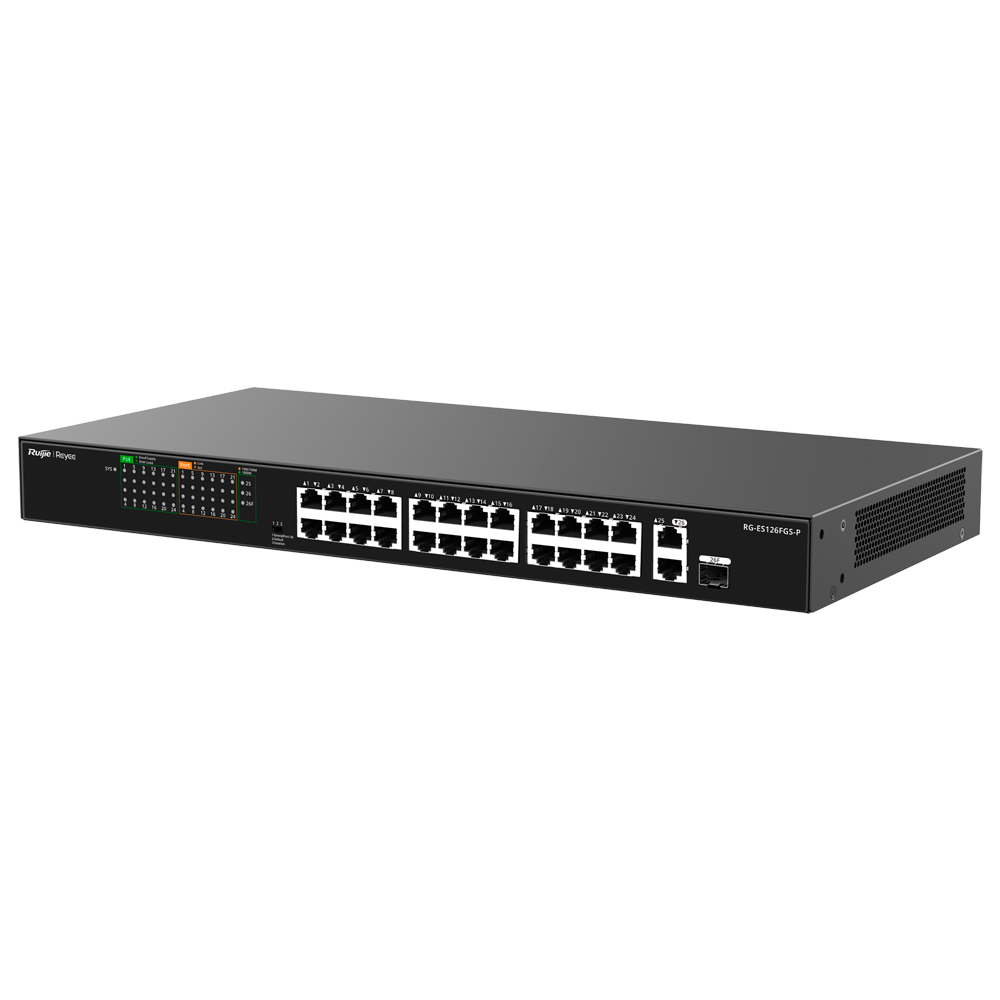 Home Switch PoE RG-ES126FGS-P RG-ES126FGS-P SKU: RG-ES126FGS-P 303,64 € 319,62 € Desconto de %. IVA incluído. Comprar Contactar Adicionar à wishlist Reyee PoE Desktop Switch24 RJ45 Portas 1 + RJ45 Uplink 1 + [%VAR%] SFP Combo24 Portas 10/100Mbps + 2 Portas 10/100/1000Mbp24 Portas PoE+ 802.3af/at | Potência total 370WIsolamento de portas / Controlo de fluxo / PoE WatchdogPlug and PlayEspecificaçõesMarca:ReyeeInterface:1 Puerto SFP/RJ45 Combo (se puede usar el puerto SFP o el puerto RJ45 pero no ambos a la vez)Características del PoE:Potencia PoE total de 370WFunciones:Aislado de Puertos, Poe Watchdog, Poe ExtendidoGestión:No gestionable, pero visible desde Ruijie cloud si al menos hay un sw gestionable en la instalaciónAncho de Banda:8,8GbpsTasa de Reenvío de Paquetes:6,55MbpsTabla MAC:8KTecnologías Soportadas:Modo Auto-Negociación / Auto MDI/MDIXAlimentación:100V a 240V AC 6,0AConsumo Máximo:< 370WTemperatura de funcionamiento:0º C ~ 45º CDimensiones / Peso:440 x 214,9 x 44 mmPeso:3,78 Kg Partilhar