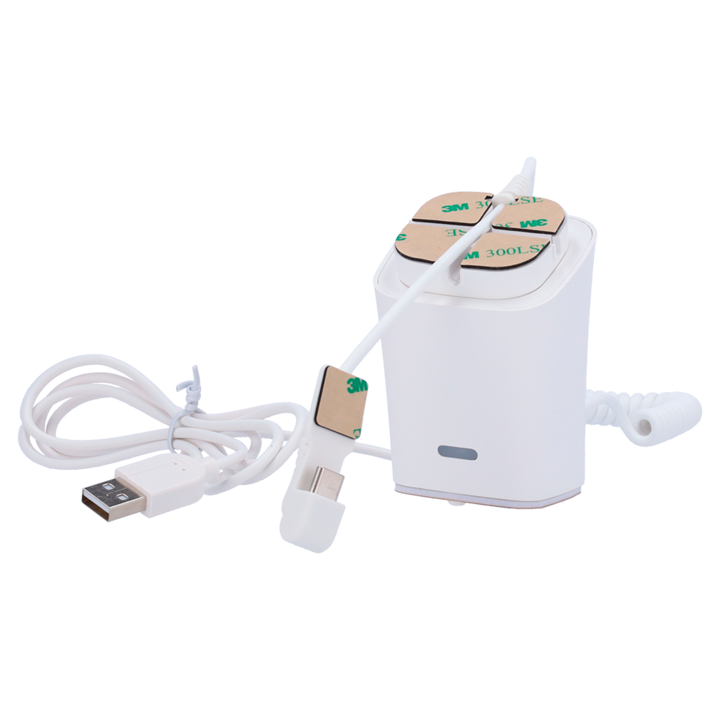 Alarme acústico de 100 dB e indicador luminoso Ativação por movimento do suporte (tamper) ou por remoção do cabo Lightning
