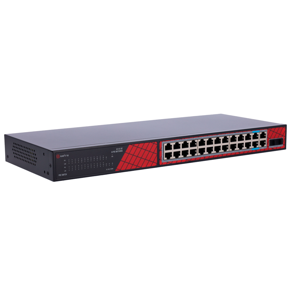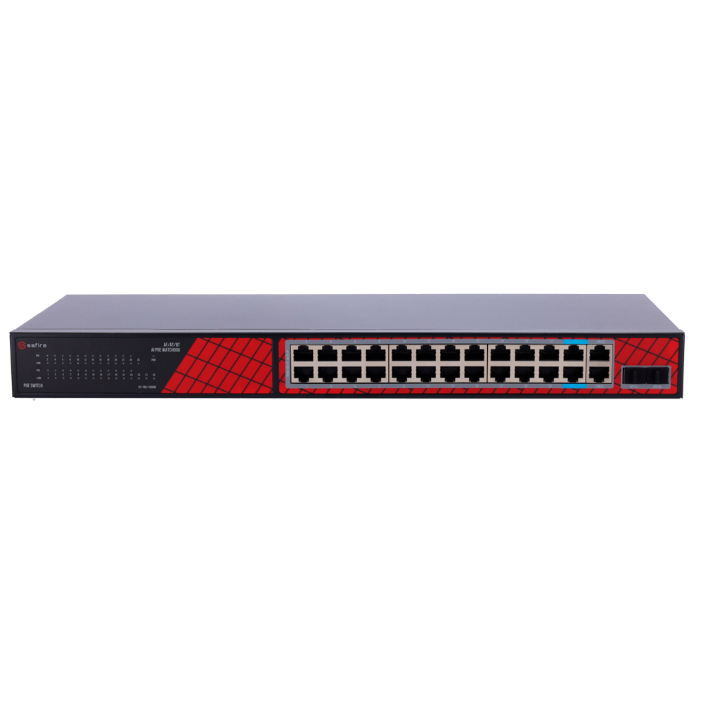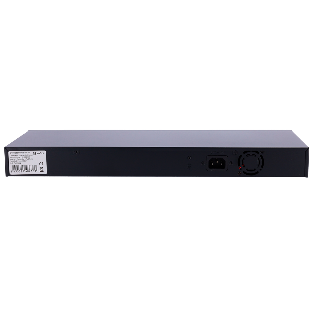 Home Switch PoE SF-SW2824HIPOE-GF-300 SF-SW2824HIPOE-GF-300 SKU: SF-SW2824HIPOE-GF-300 236,97 € 249,44 € Desconto de %. IVA incluído. Comprar Contactar Adicionar à wishlist Safire Switch Hi-PoE24 portas + 2 SFP Uplink + 2 Uplink RJ45Velocidade da porta Gigabit 10/100/1000 Mbps22 Portas PoE+ 30W + 2 Portas Hi-PoE 60WPoE WatchdogAté 300W Potência PoE totalEspecificaçõesInterfaces:24 portasnRJ45 PoE + 2 Uplink RJ45 + 2 Uplink SFPVelocidade da porta RJ45:24x 10/100/1000Mbps + 4x 10/100/1000MbpsCaracterísticas PoE:Porta 23~24 Hi-PoE Até 60W 802.3af/at/btportas de Uplink:SFP 27~28: 10/100/1000Mbps portas SFP uplinkDistância de transmissão:Porta 1~24 130 metros 10/100Mbps, 250 metros 10 MbpsLargura de Banda:56 GbpsTabela MAC:8KLatência:1000MBps < 16?s (utilizando 64 byte packet size)AI PoE:Portas PoE Watchdog 1~24 - Reinício automático da alimentação elétrica de uma porta PoE quando é detetada uma possível falha.Alimentação:Tomada traseira 100~240VProteções:8KV Proteção ESDTemperatura de funcionamento:-30° C - 60° CDimensões:180 (Fo) x 45 (Al) x 440 (An) mmPeso:2,65Kg Partilhar