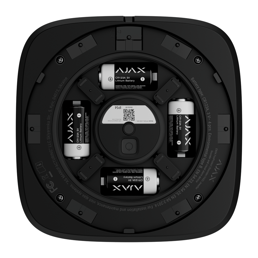 A AJ-EN54-SOUNDER-VAD-B da Ajax combina uma potente sirene e um dispositivo de alarme visual (DAV), cumprindo as normas EN 54-3, EN 54-23 e EN 54-25. A ativação sonora (até 100 dB, com 32 tons) e visual (flash LED sincronizado) garantem uma evacuação eficiente, visível para todos, incluindo pessoas com dificuldades auditivas.