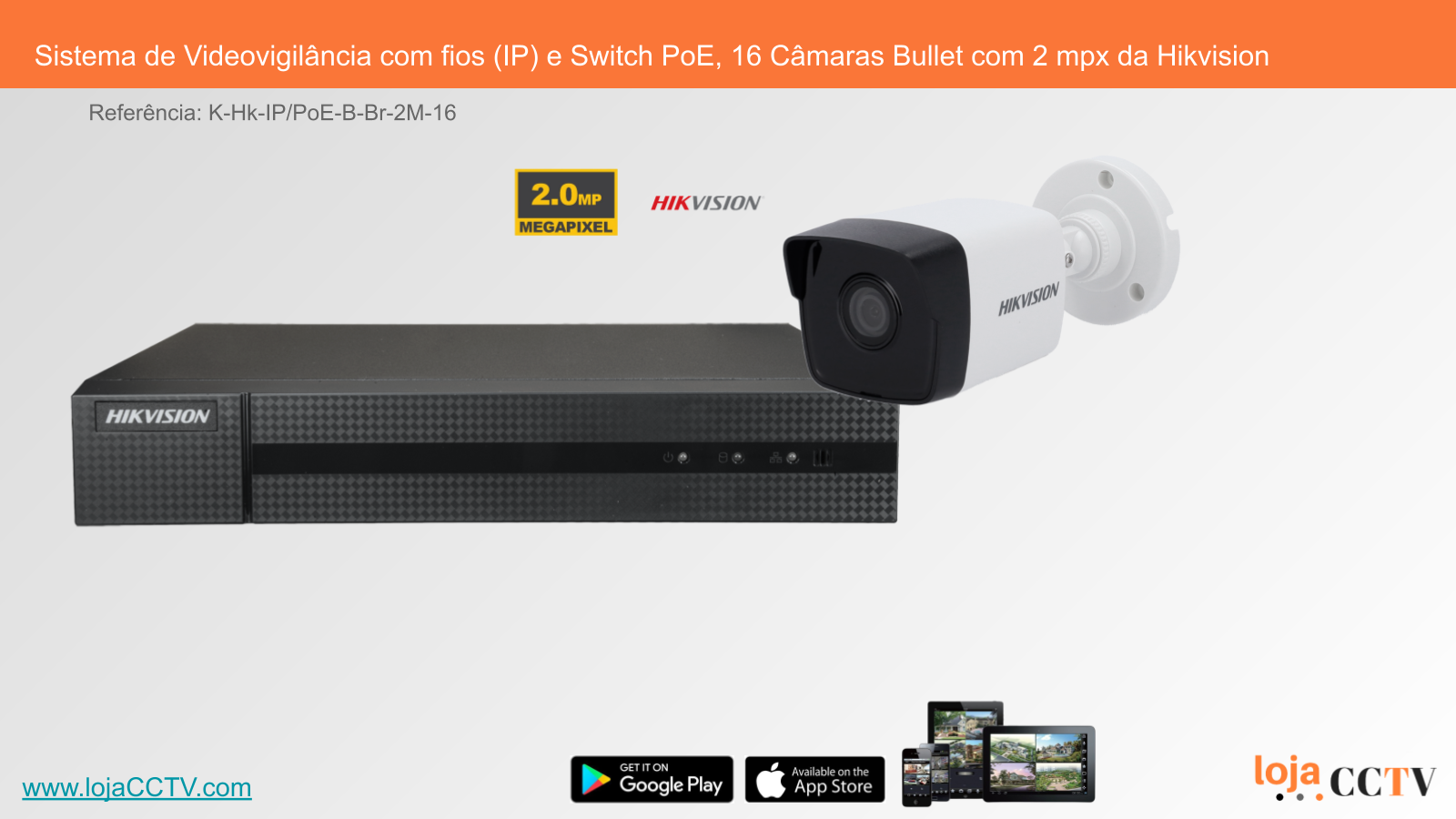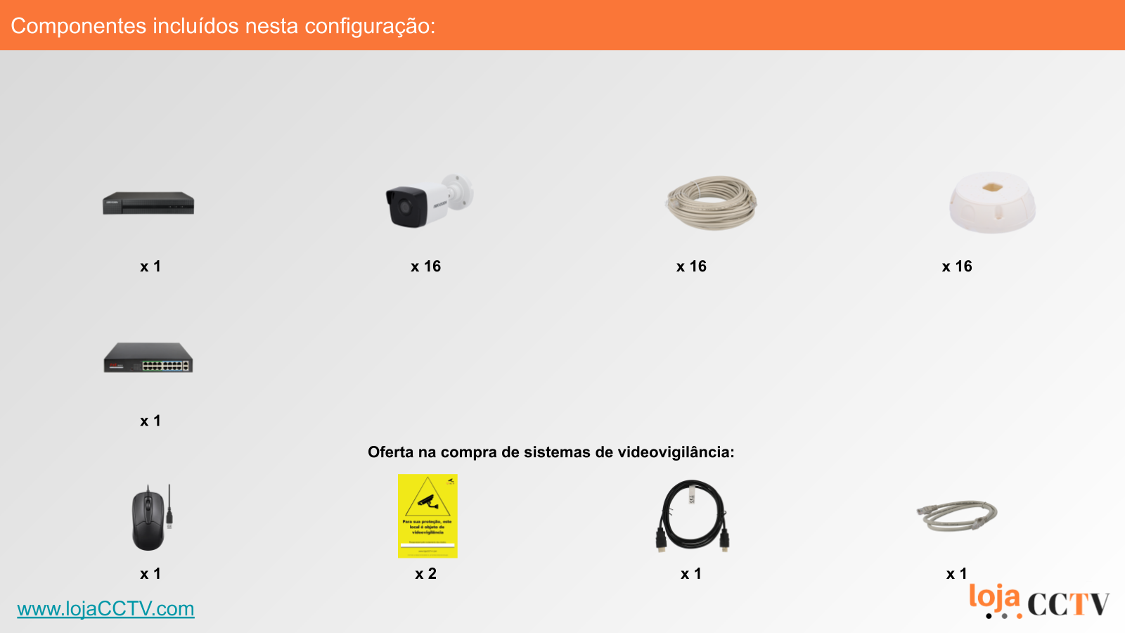 Sistema de Videovigilância com fios (IP) e Switch PoE, 16 Câmaras Bullet com 2 mpx da Hikvision
