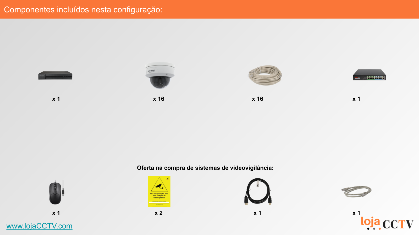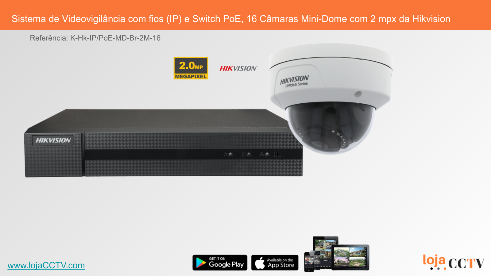 Sistema de Videovigilância com fios (IP) e Switch PoE, 16 Câmaras Mini-Dome com 2 mpx da Hikvision
