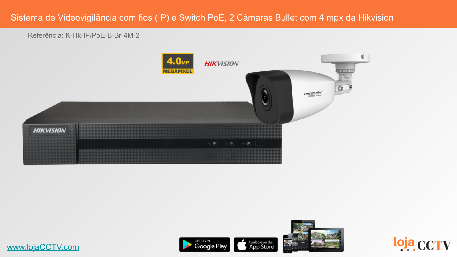 Sistema de Videovigilância com fios (IP) e Switch PoE, 2 Câmaras Bullet com 4 mpx da Hikvision