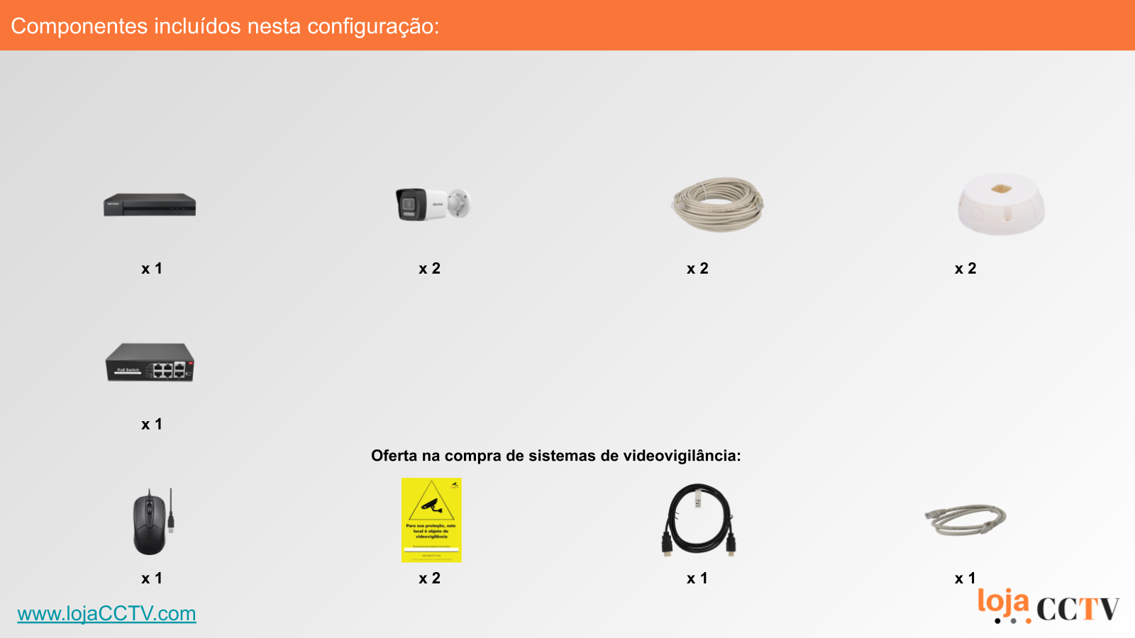 A configuração apresentada é ideal para a sua habitação, loja ou armazém. Com uma resolução de 8 mpx, cada câmara tem qualidade de imagem ideal para cobrir uma área mais de 50 m². Se tiver áreas superiores, podemos alterar a configuração para incluir uma ou mais câmaras de resolução superior, ou temos outras configurações de sistemas completos disponíveis.