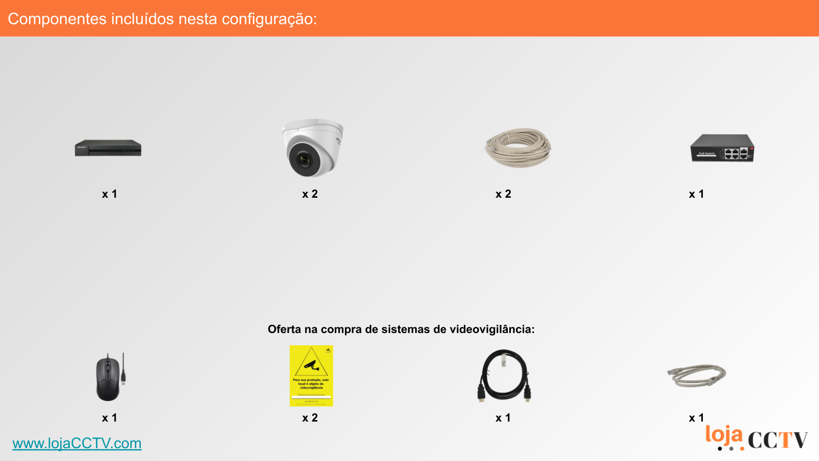 A configuração apresentada é ideal para a sua habitação, loja ou armazém. Com uma resolução de 2 mpx, cada câmara tem qualidade de imagem ideal para cobrir uma área até 25 m². Se tiver áreas superiores, podemos alterar a configuração para incluir uma ou mais câmaras de resolução superior, ou temos outras configurações de sistemas completos disponíveis.