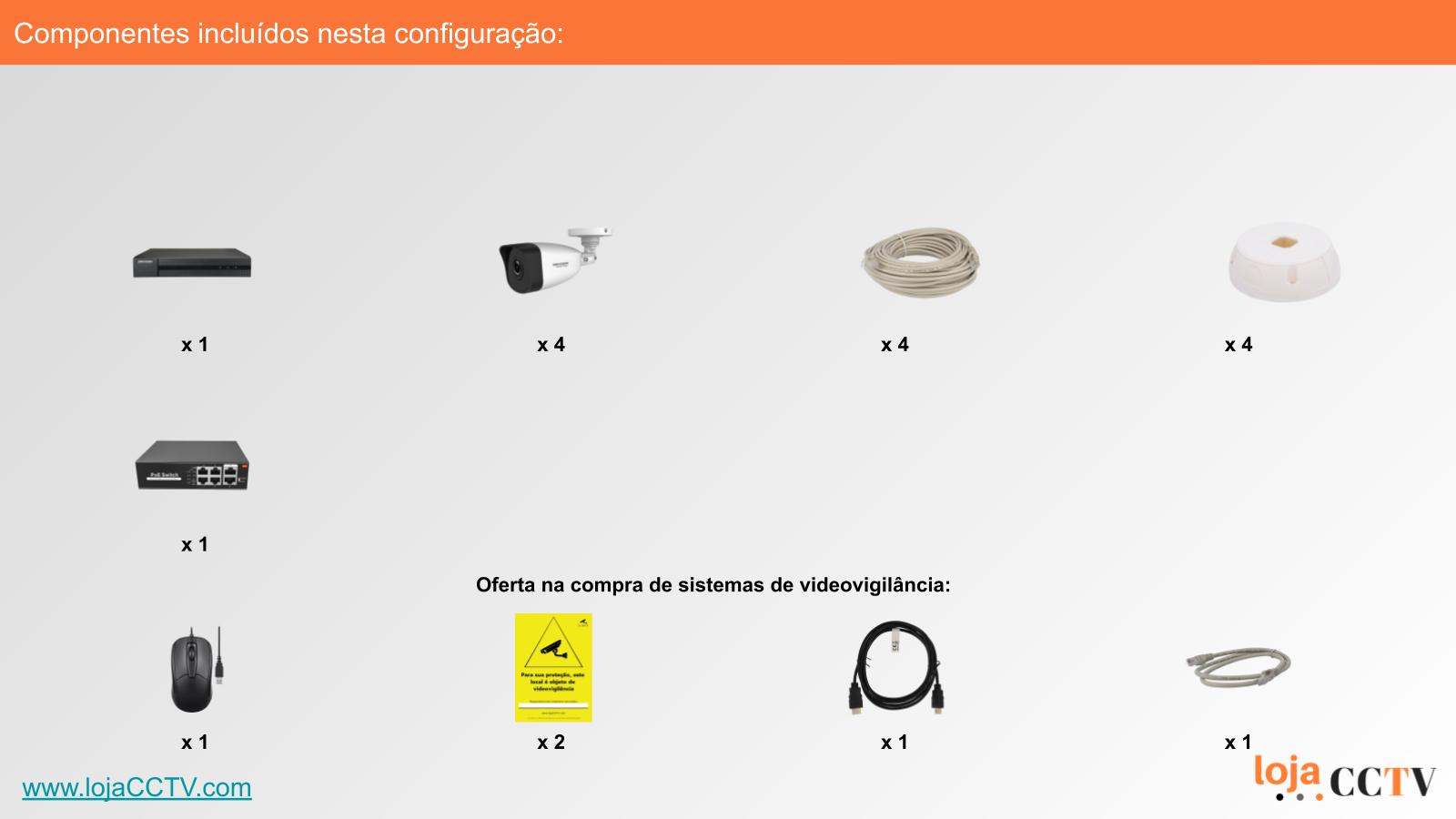 A configuração apresentada é ideal para a sua habitação, loja ou armazém. Com uma resolução de 4 mpx, cada câmara tem qualidade de imagem ideal para cobrir uma área até 50 m². Se tiver áreas superiores, podemos alterar a configuração para incluir uma ou mais câmaras de resolução superior, ou temos outras configurações de sistemas completos disponíveis.