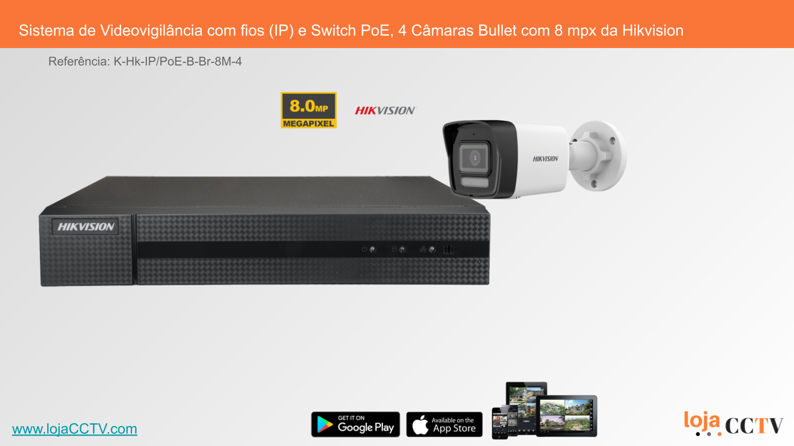 Sistema de Videovigilância com fios (IP) e Switch PoE, 4 Câmaras Bullet com 8 mpx da Hikvision