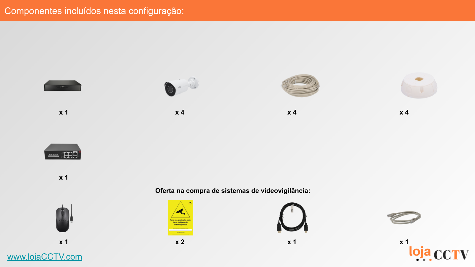 A configuração apresentada é ideal para a sua habitação, loja ou armazém. Com uma resolução de 8 mpx, cada câmara tem qualidade de imagem ideal para cobrir uma área mais de 50 m². Se tiver áreas superiores, podemos alterar a configuração para incluir uma ou mais câmaras de resolução superior, ou temos outras configurações de sistemas completos disponíveis.