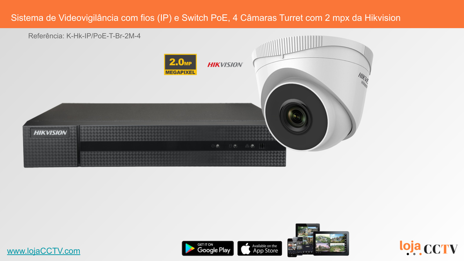 Sistema de Videovigilância com fios (IP) e Switch PoE, 4 Câmaras Turret com 2 mpx da Hikvision