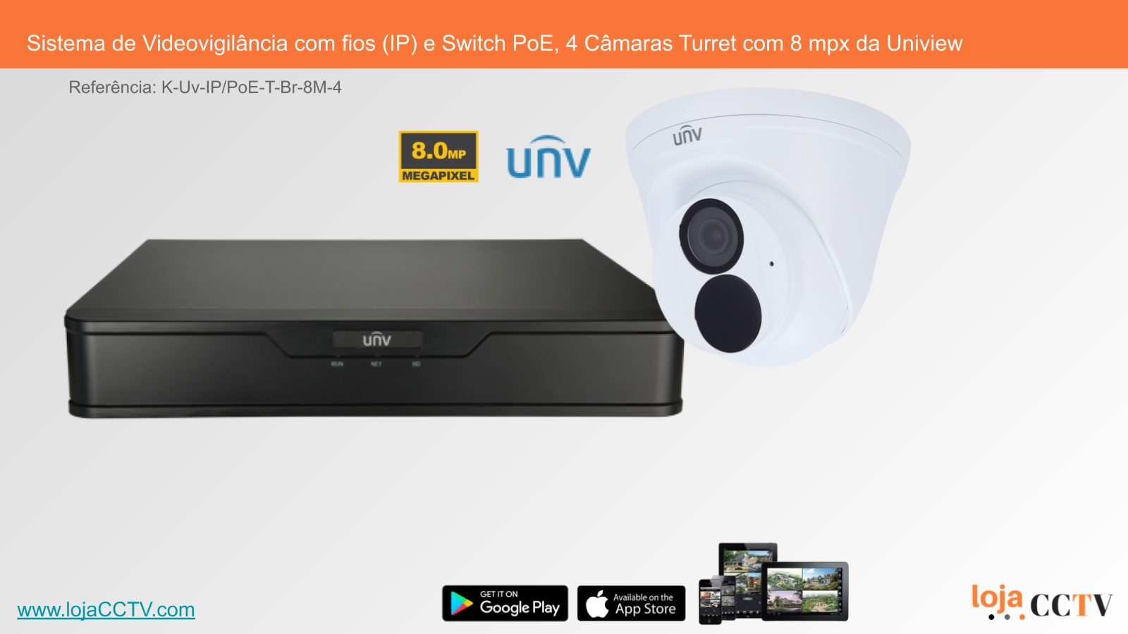 Sistema de Videovigilância com fios (IP) e Switch PoE, 4 Câmaras Turret com 8 mpx da Uniview