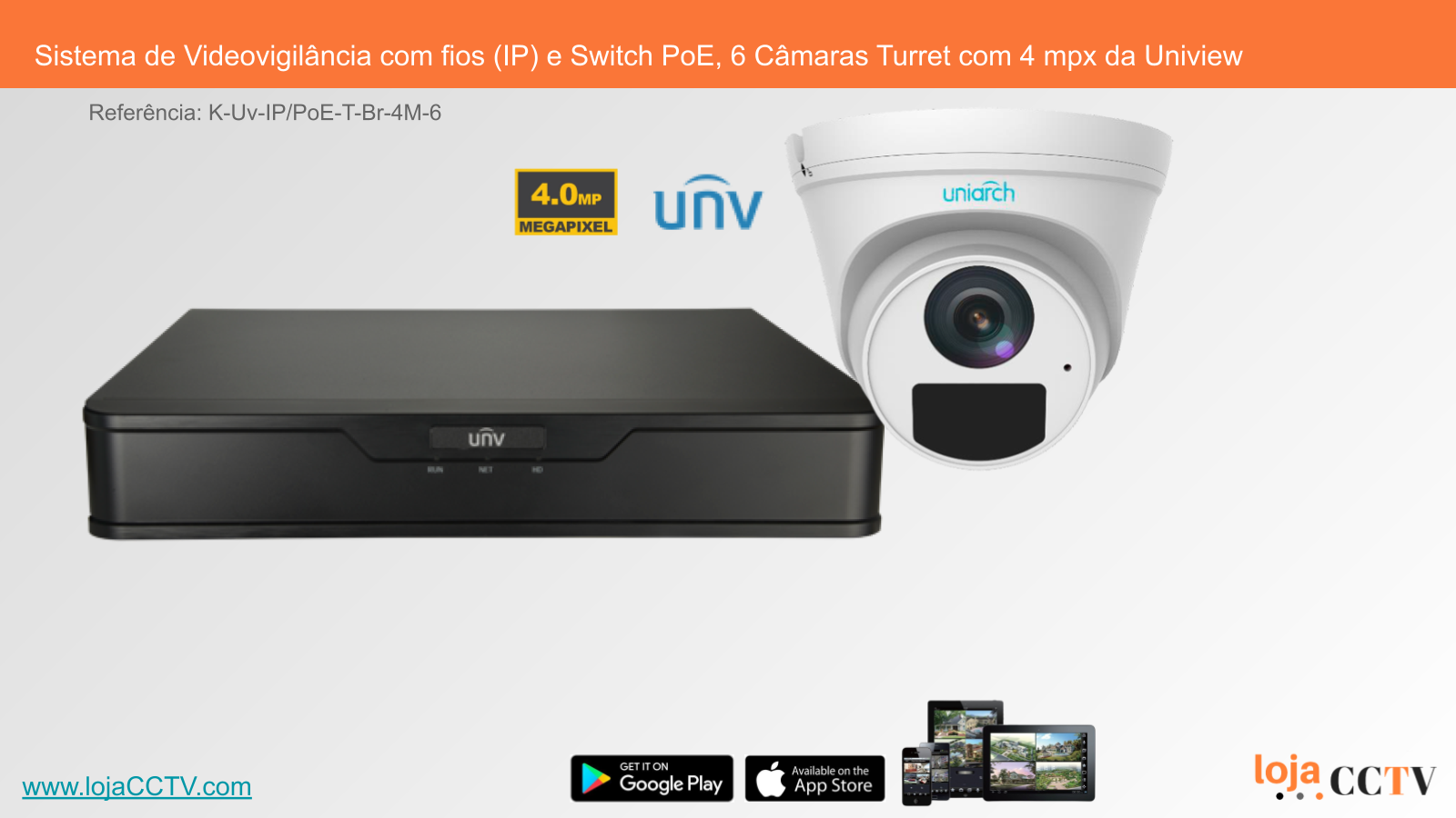Sistema de Videovigilância com fios (IP) e Switch PoE, 6 Câmaras Turret com 4 mpx da Uniview