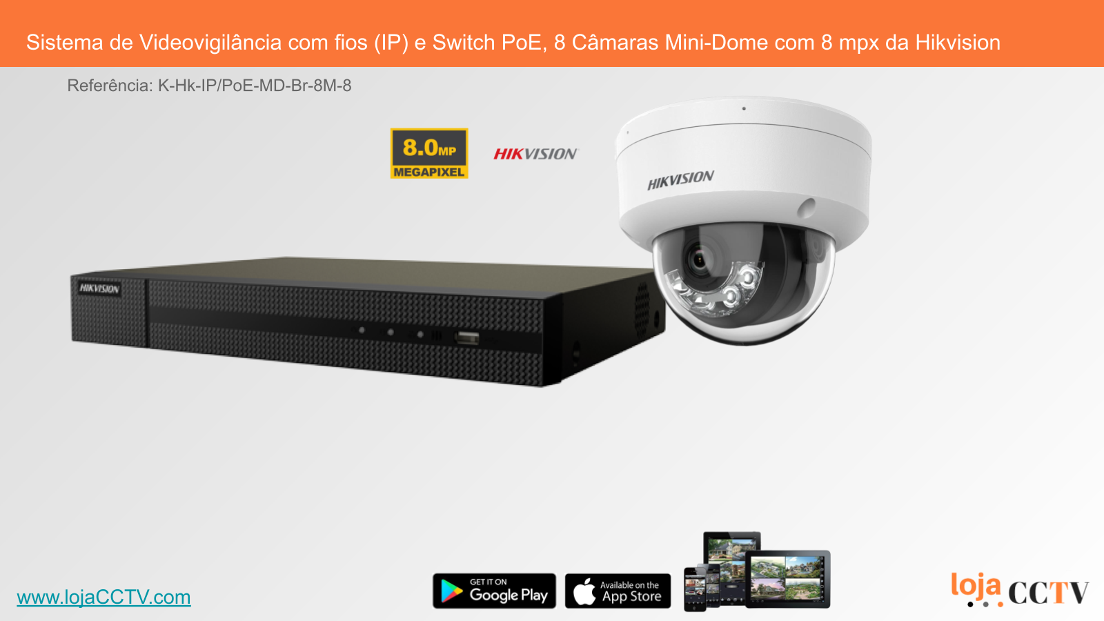 Sistema de Videovigilância com fios (IP) e Switch PoE, 8 Câmaras Mini-Dome com 8 mpx da Hikvision