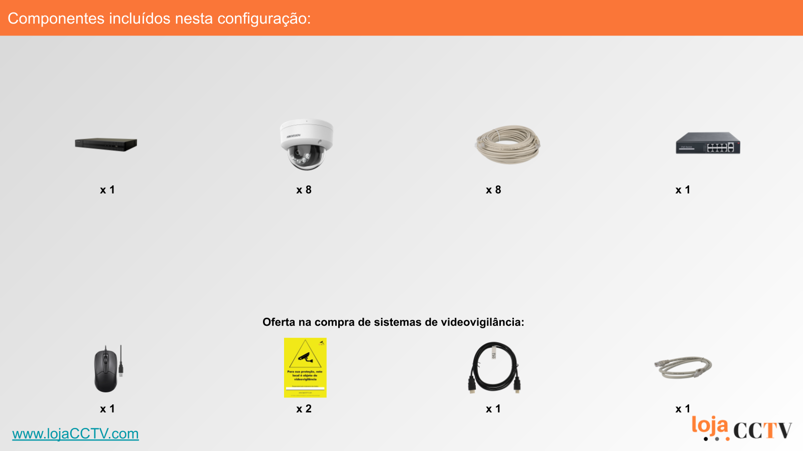 A configuração apresentada é ideal para a sua habitação, loja ou armazém. Com uma resolução de 8 mpx, cada câmara tem qualidade de imagem ideal para cobrir uma área mais de 50 m⊃2;. Se tiver áreas superiores, podemos alterar a configuração para incluir uma ou mais câmaras de resolução superior, ou temos outras configurações de sistemas completos disponíveis.
