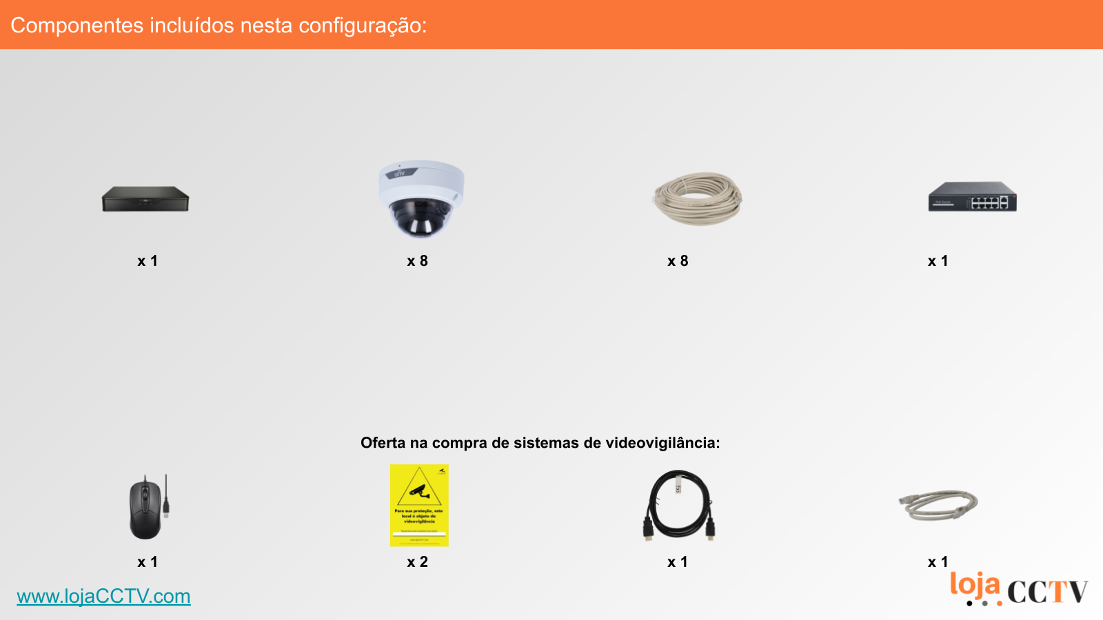 A configuração apresentada é ideal para a sua habitação, loja ou armazém. Com uma resolução de 8 mpx, cada câmara tem qualidade de imagem ideal para cobrir uma área mais de 50 m². Se tiver áreas superiores, podemos alterar a configuração para incluir uma ou mais câmaras de resolução superior, ou temos outras configurações de sistemas completos disponíveis.