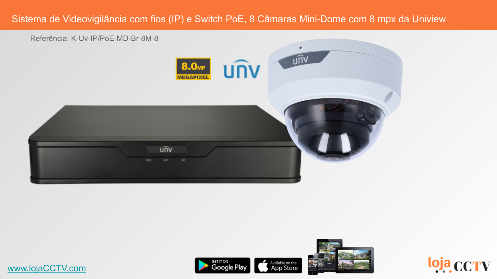 Sistema de Videovigilância com fios (IP) e Switch PoE, 8 Câmaras Mini-Dome com 8 mpx da Uniview