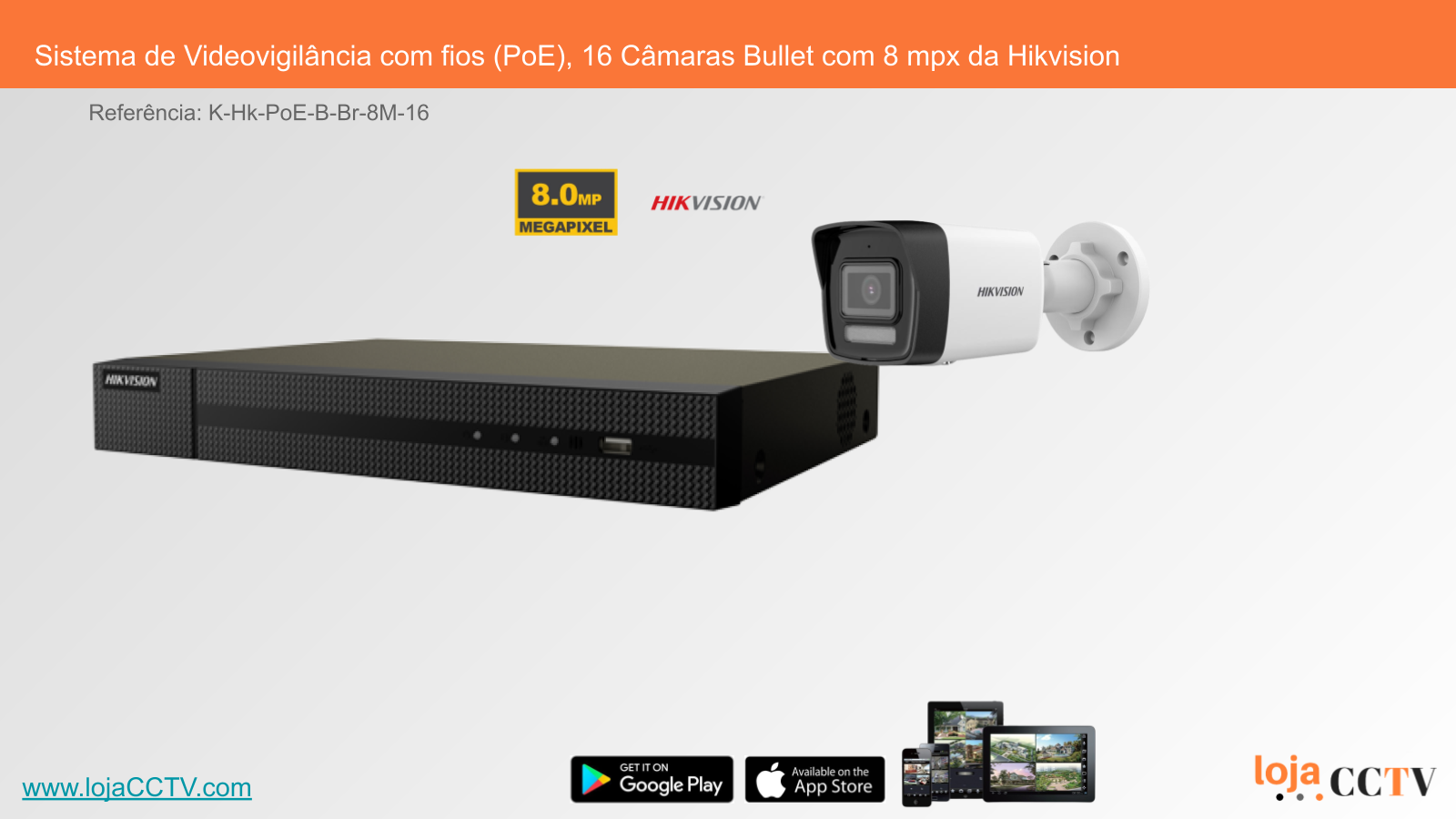 Sistema de Videovigilância com fios (PoE), 16 Câmaras Bullet com 8 mpx da Hikvision