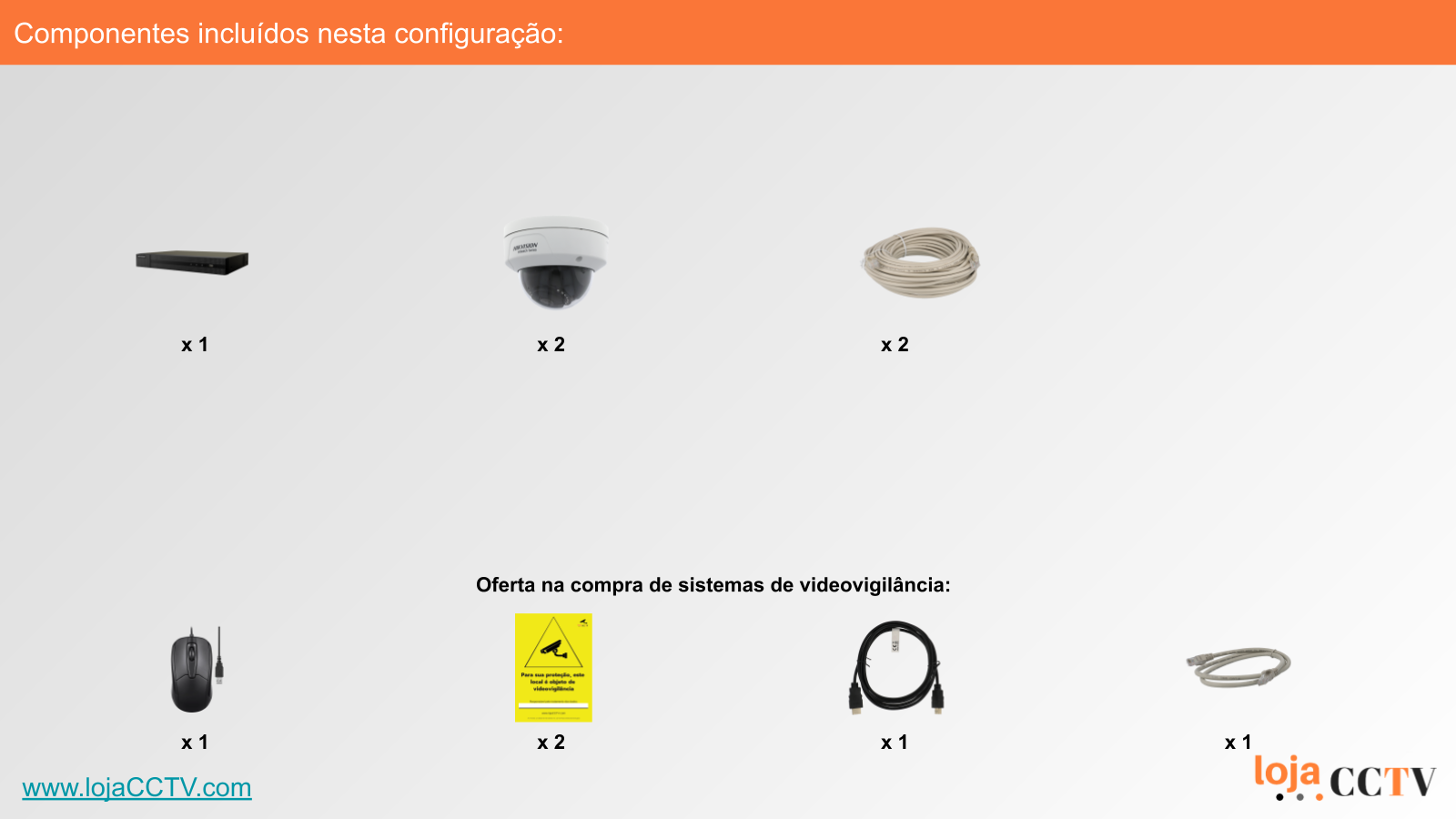 A configuração apresentada é ideal para a sua habitação, loja ou armazém. Com uma resolução de 2 mpx, cada câmara tem qualidade de imagem ideal para cobrir uma área até 25 m². Se tiver áreas superiores, podemos alterar a configuração para incluir uma ou mais câmaras de resolução superior, ou temos outras configurações de sistemas completos disponíveis.
