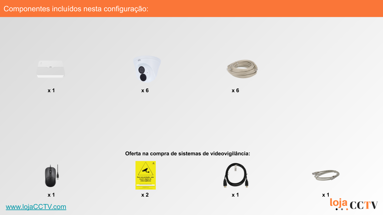 A configuração apresentada é ideal para a sua habitação, loja ou armazém. Com uma resolução de 8 mpx, cada câmara tem qualidade de imagem ideal para cobrir uma área mais de 50 m². Se tiver áreas superiores, podemos alterar a configuração para incluir uma ou mais câmaras de resolução superior, ou temos outras configurações de sistemas completos disponíveis.