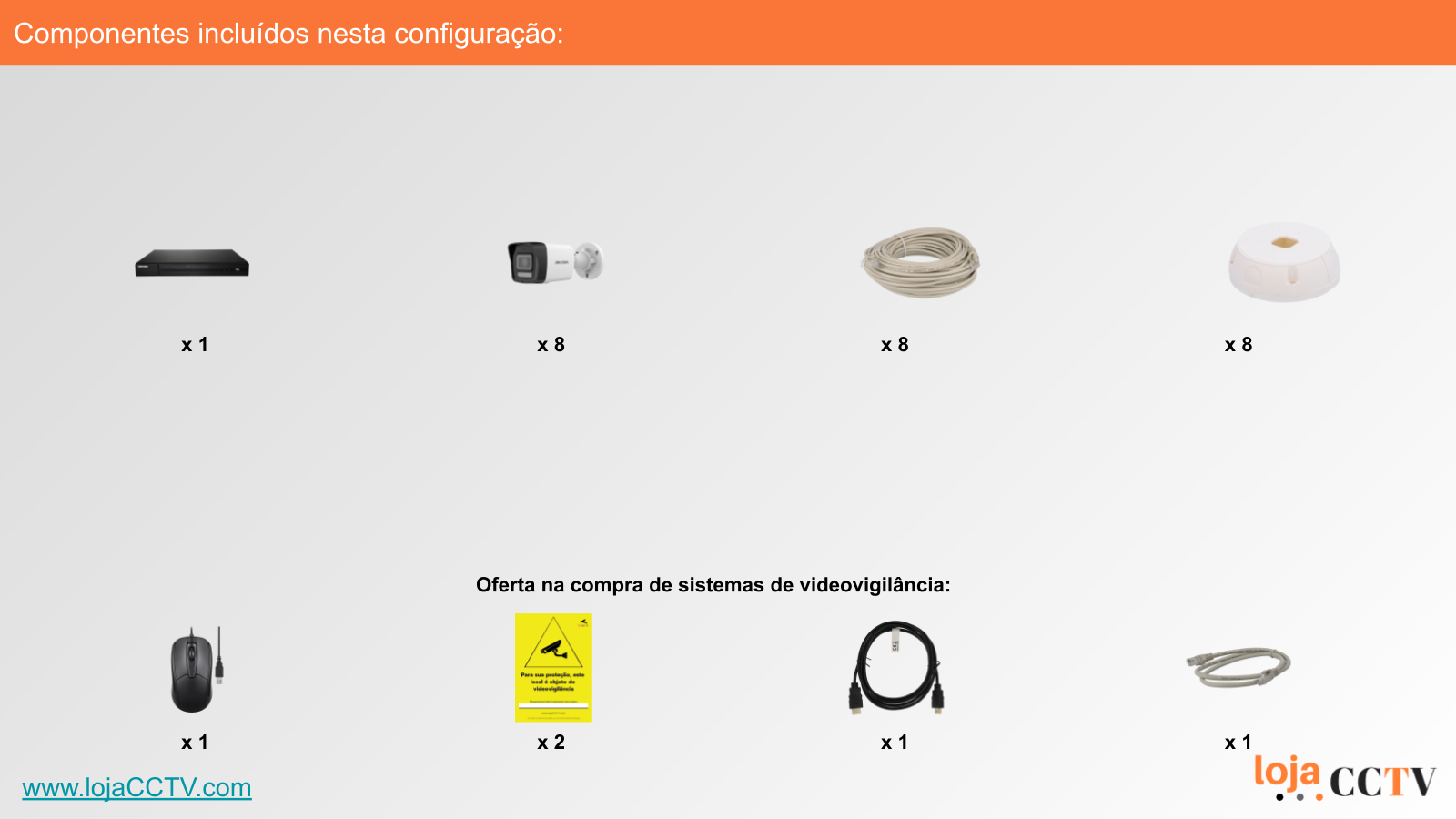 A configuração apresentada é ideal para a sua habitação, loja ou armazém. Com uma resolução de 8 mpx, cada câmara tem qualidade de imagem ideal para cobrir uma área mais de 50 m². Se tiver áreas superiores, podemos alterar a configuração para incluir uma ou mais câmaras de resolução superior, ou temos outras configurações de sistemas completos disponíveis.
