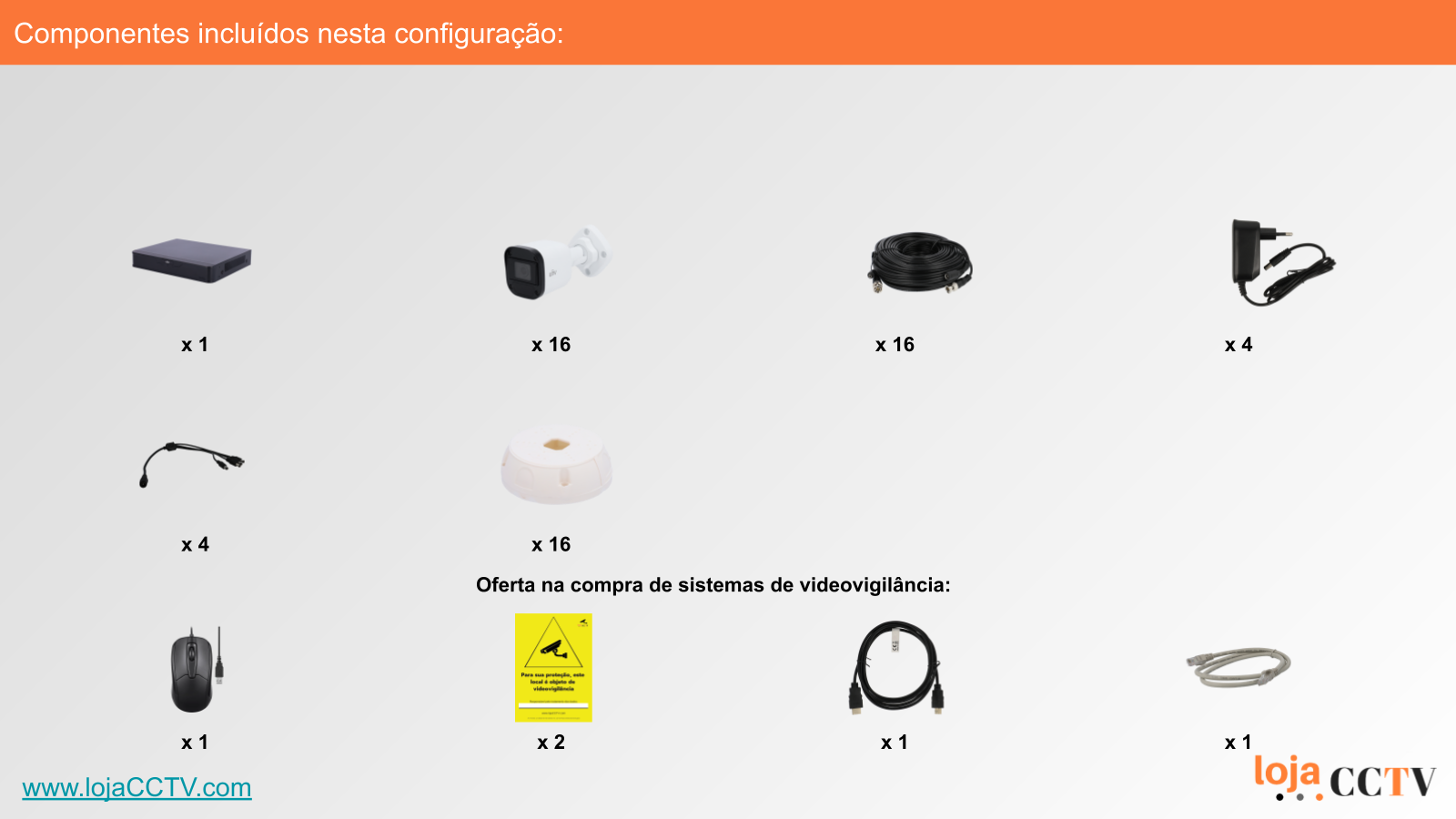 A configuração apresentada é ideal para a sua habitação, loja ou armazém. Com uma resolução de 5 mpx, cada câmara tem qualidade de imagem ideal para cobrir uma área até 50 m². Se tiver áreas superiores, podemos alterar a configuração para incluir uma ou mais câmaras de resolução superior, ou temos outras configurações de sistemas completos disponíveis.