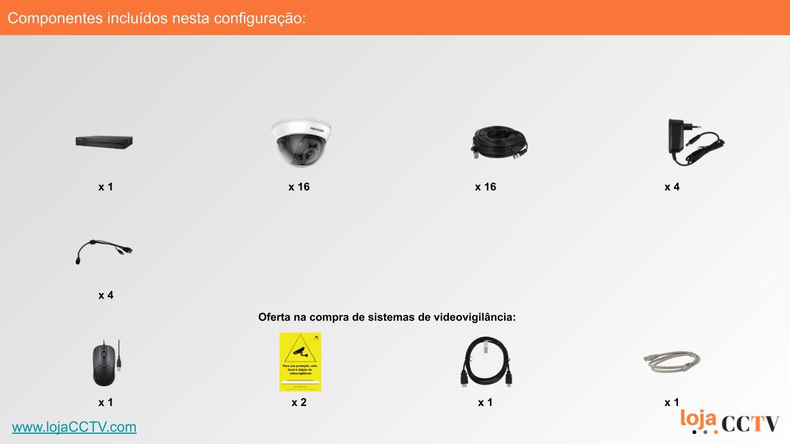A configuração apresentada é ideal para a sua habitação, loja ou armazém. Com uma resolução de 2 mpx, cada câmara tem qualidade de imagem ideal para cobrir uma área até 25 m². Se tiver áreas superiores, podemos alterar a configuração para incluir uma ou mais câmaras de resolução superior, ou temos outras configurações de sistemas completos disponíveis.