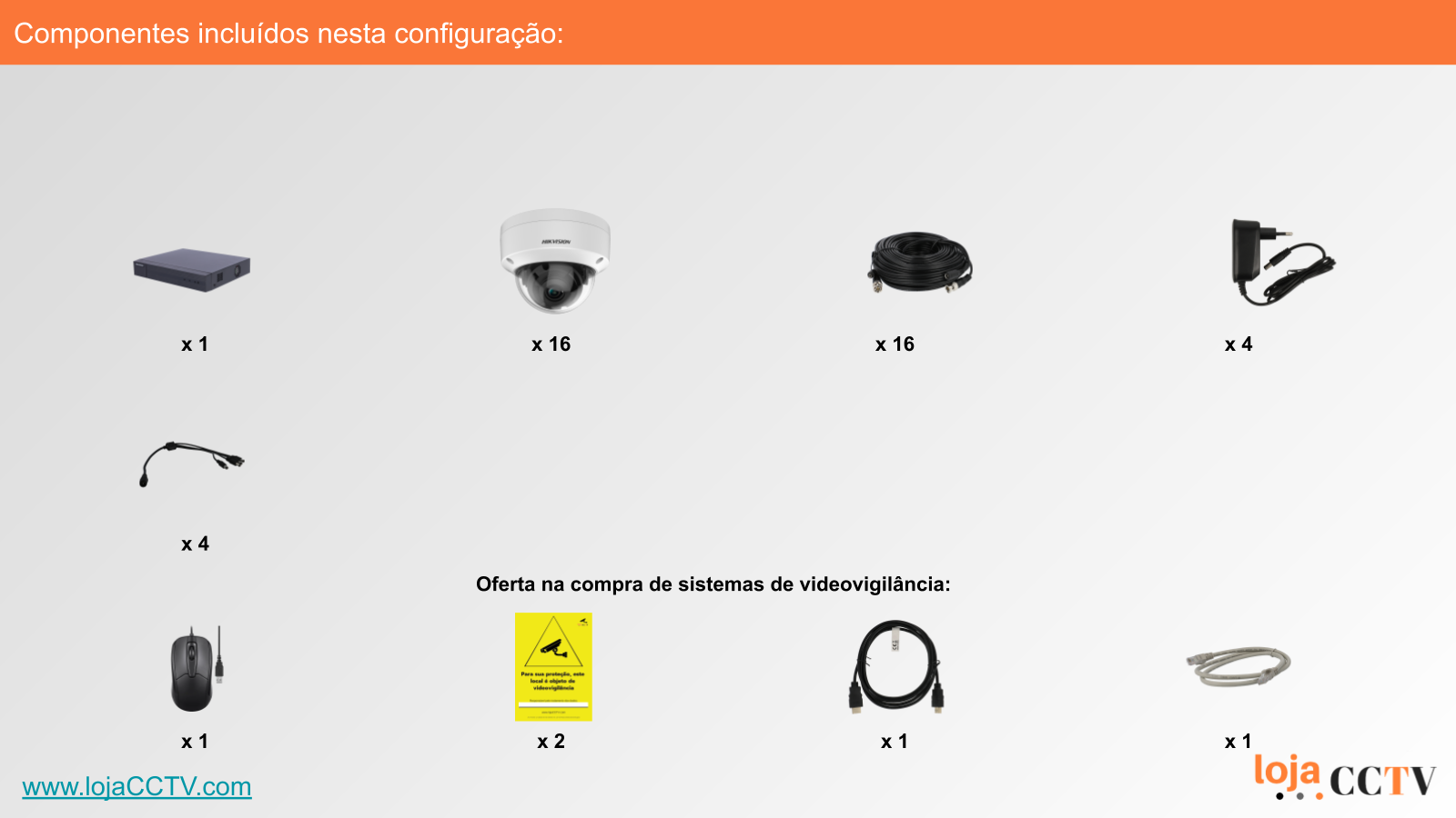 A configuração apresentada é ideal para a sua habitação, loja ou armazém. Com uma resolução de 5 mpx, cada câmara tem qualidade de imagem ideal para cobrir uma área até 50 m². Se tiver áreas superiores, podemos alterar a configuração para incluir uma ou mais câmaras de resolução superior, ou temos outras configurações de sistemas completos disponíveis.