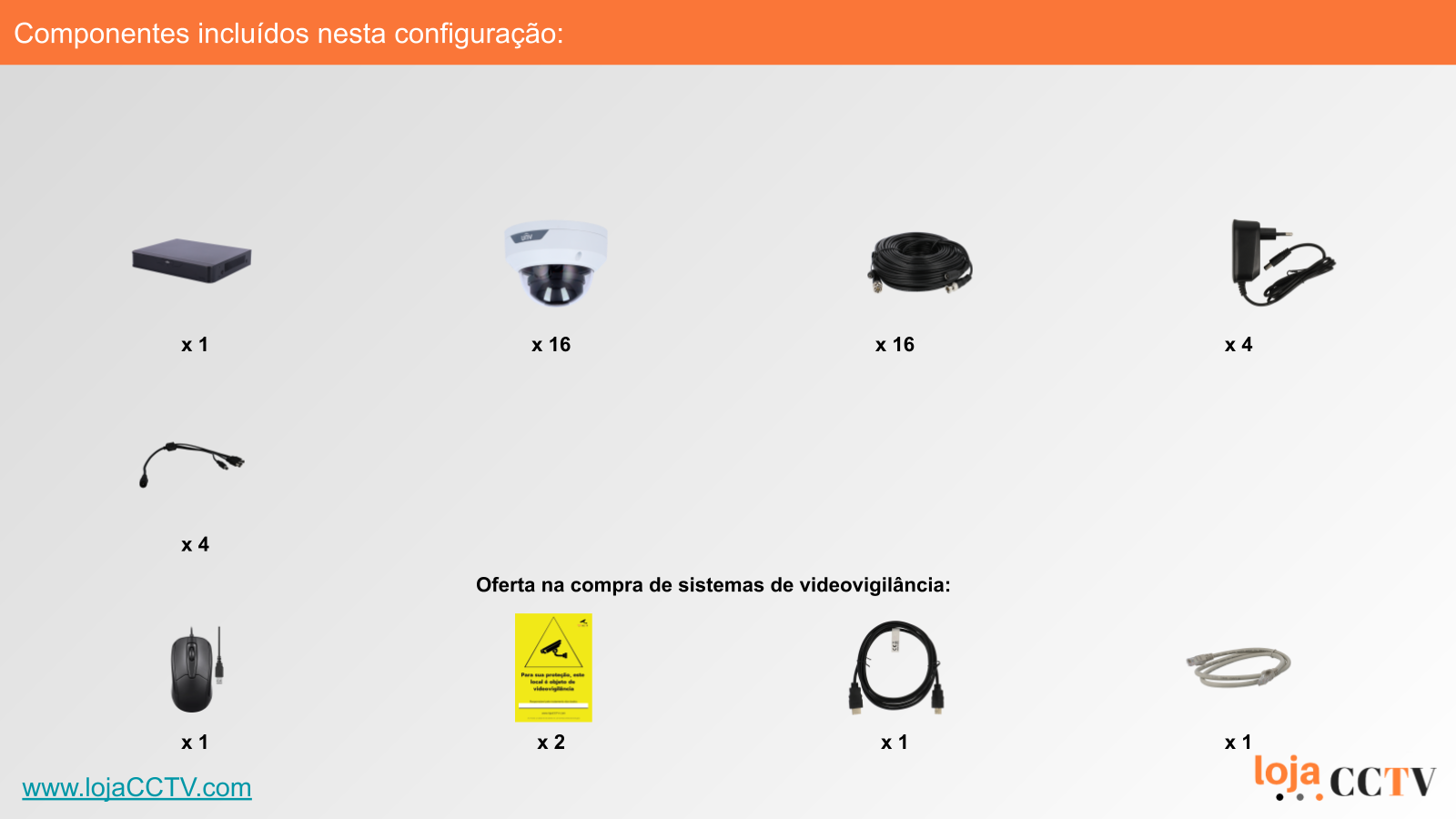 A configuração apresentada é ideal para a sua habitação, loja ou armazém. Com uma resolução de 5 mpx, cada câmara tem qualidade de imagem ideal para cobrir uma área até 50 m². Se tiver áreas superiores, podemos alterar a configuração para incluir uma ou mais câmaras de resolução superior, ou temos outras configurações de sistemas completos disponíveis.