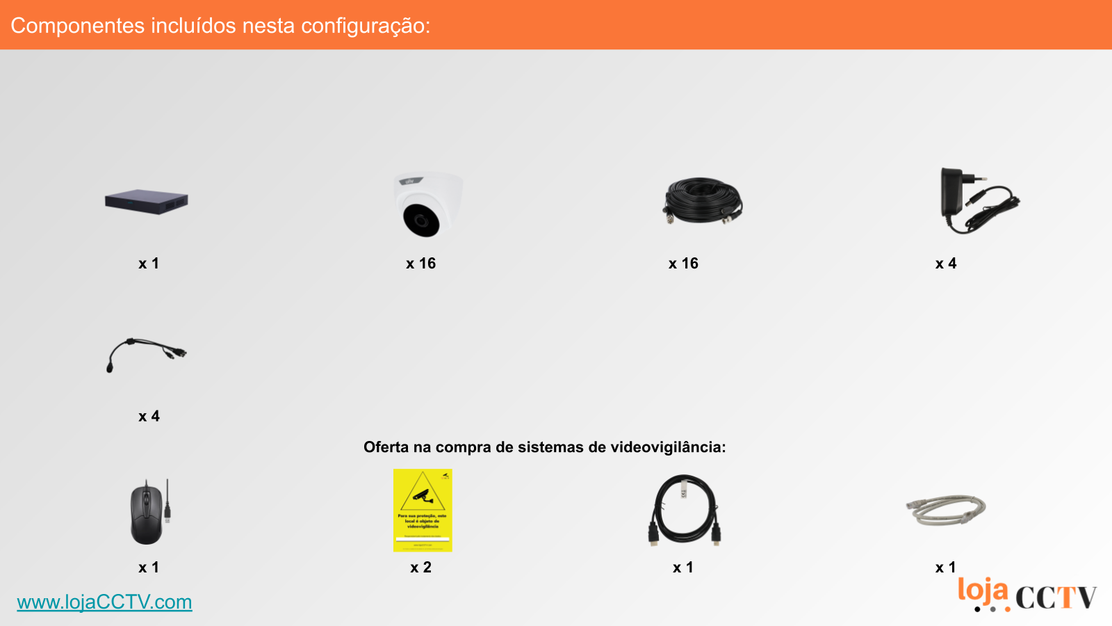 A configuração apresentada é ideal para a sua habitação, loja ou armazém. Com uma resolução de 2 mpx, cada câmara tem qualidade de imagem ideal para cobrir uma área até 25 m². Se tiver áreas superiores, podemos alterar a configuração para incluir uma ou mais câmaras de resolução superior, ou temos outras configurações de sistemas completos disponíveis.
