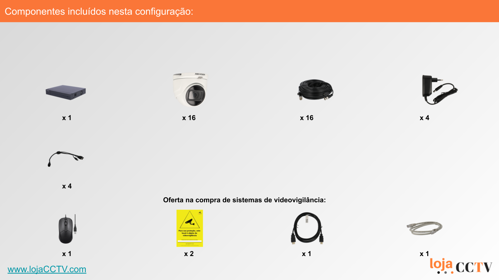 A configuração apresentada é ideal para a sua habitação, loja ou armazém. Com uma resolução de 5 mpx, cada câmara tem qualidade de imagem ideal para cobrir uma área até 50 m². Se tiver áreas superiores, podemos alterar a configuração para incluir uma ou mais câmaras de resolução superior, ou temos outras configurações de sistemas completos disponíveis.